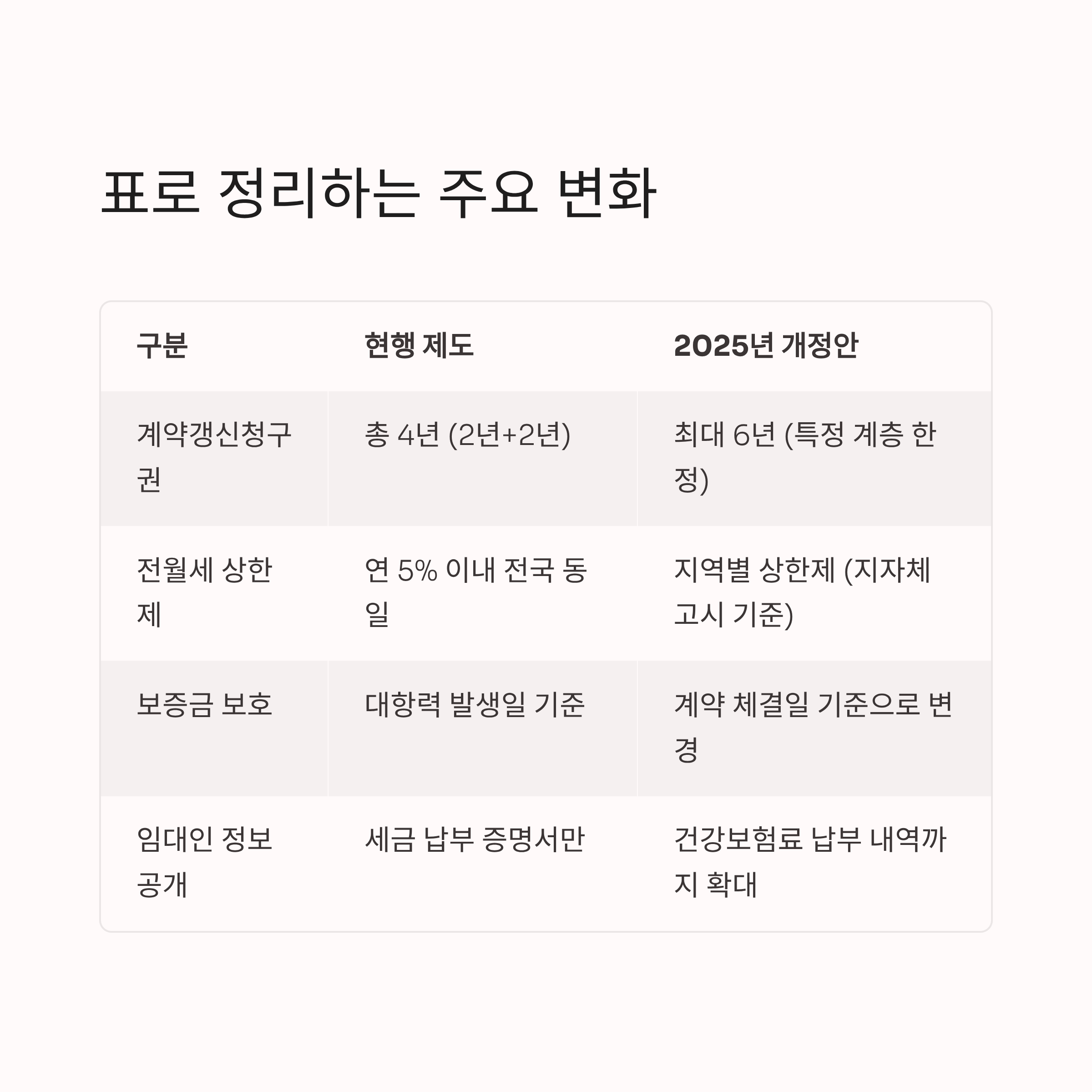 | 계약갱신청구권 | 총 4년 (2년+2년) | 최대 6년 (특정 계층 한정) |