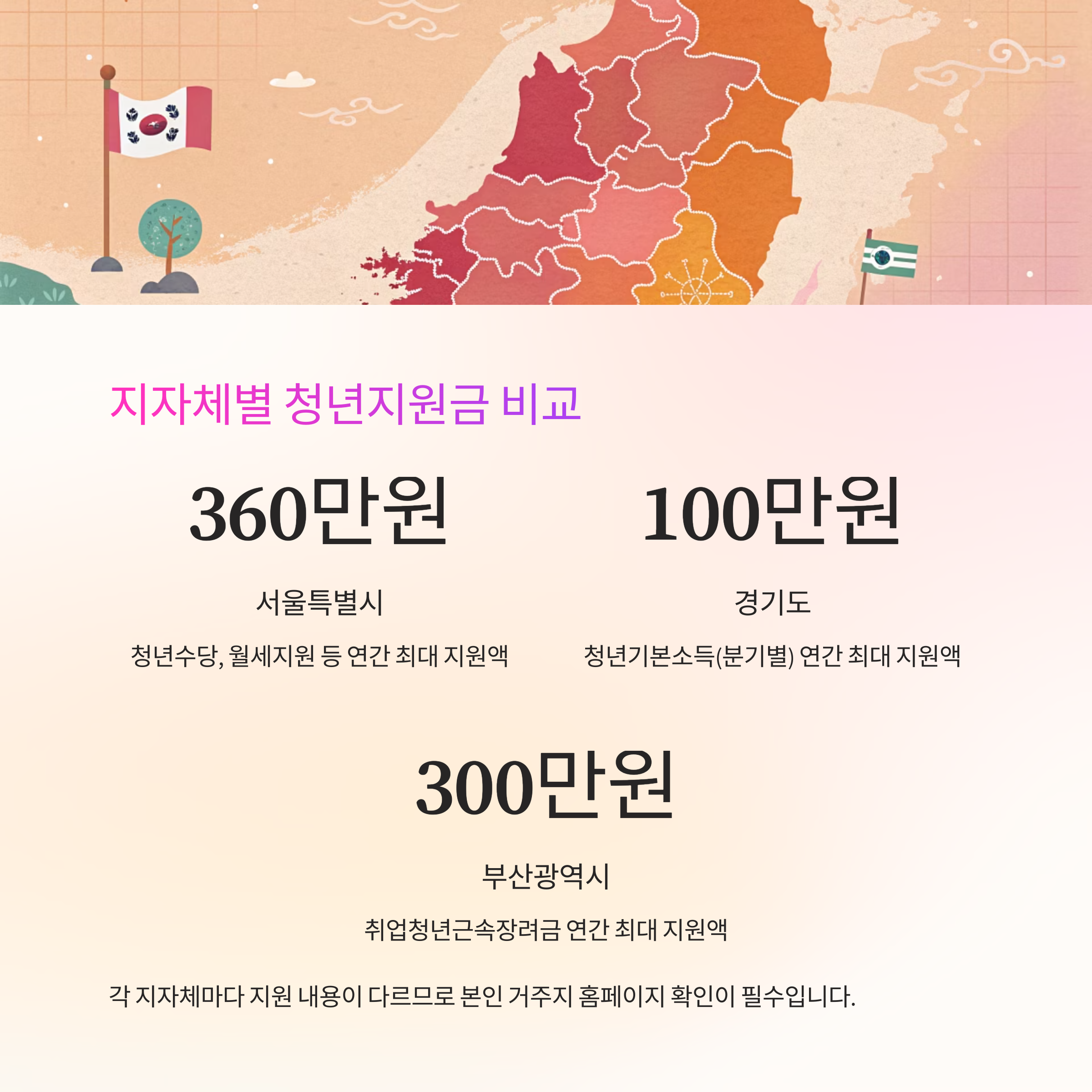 | 서울특별시 | 청년수당, 월세지원 | 360만 원 |