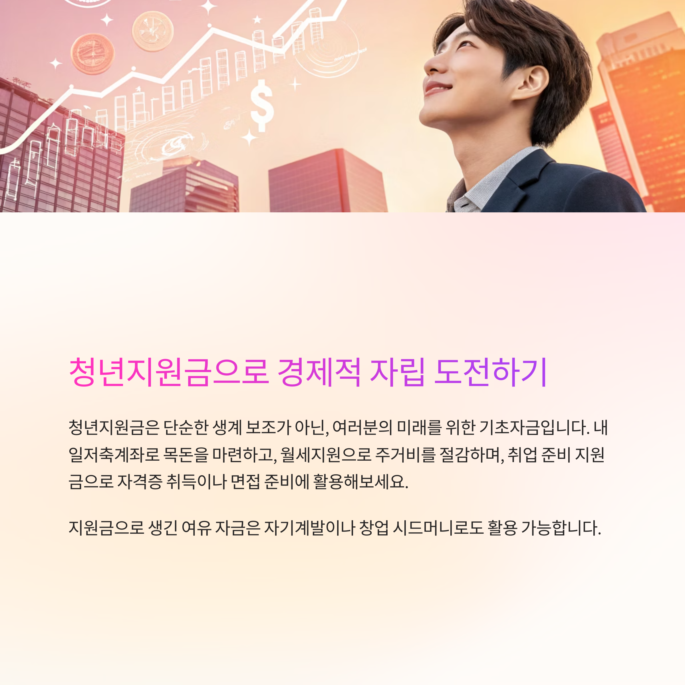 지원금은 단순한 생계 보조가 아닌, 청년의 미래 설계 기초자금이 됩니다.