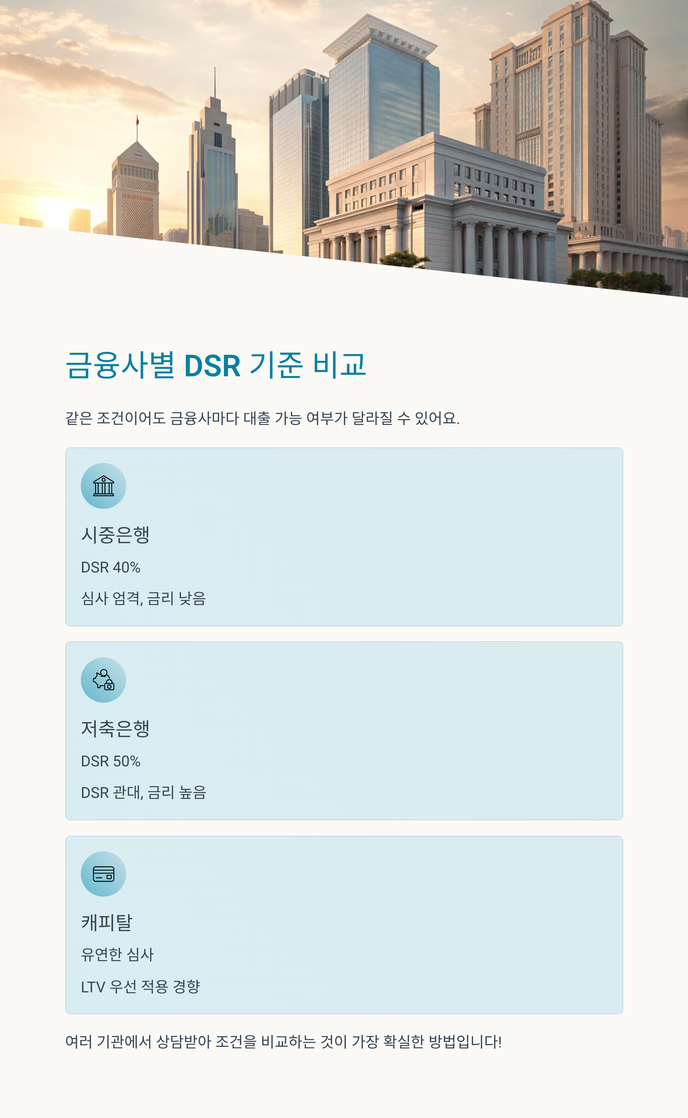 조건은 금융사마다 달라요. 특히 대출 금액이 크다면 꼭 3곳 이상 비교하세요. - DSR 최적화는 준비에서 시작
