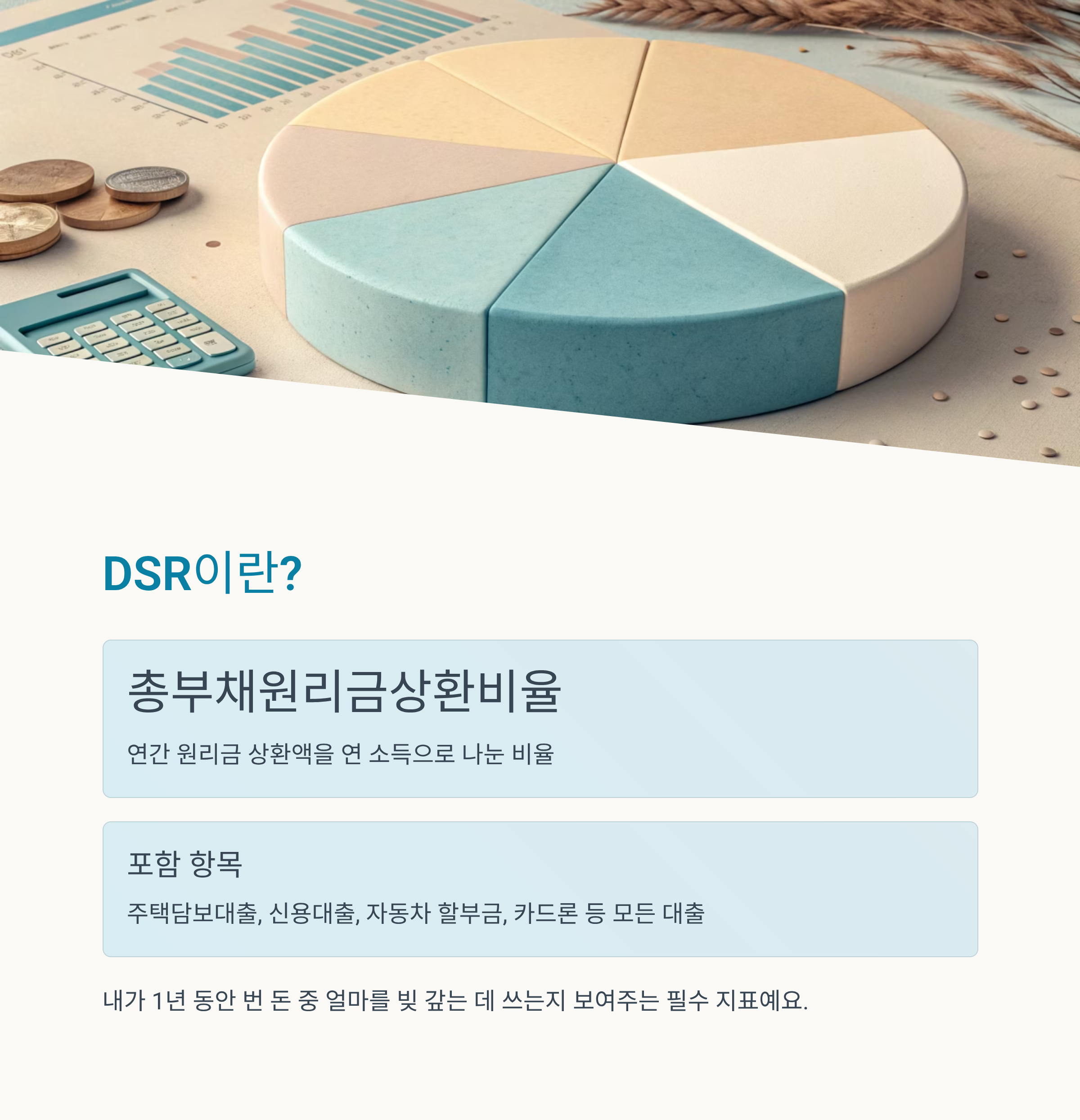 DSR은 총부채원리금상환비율(총 원리금 상환액 ÷ 연 소득)로, 내가 1년 동안 벌어들인 돈 중 얼마를 빚 갚는 데 써야 하는지를 나타내는 지표예요.