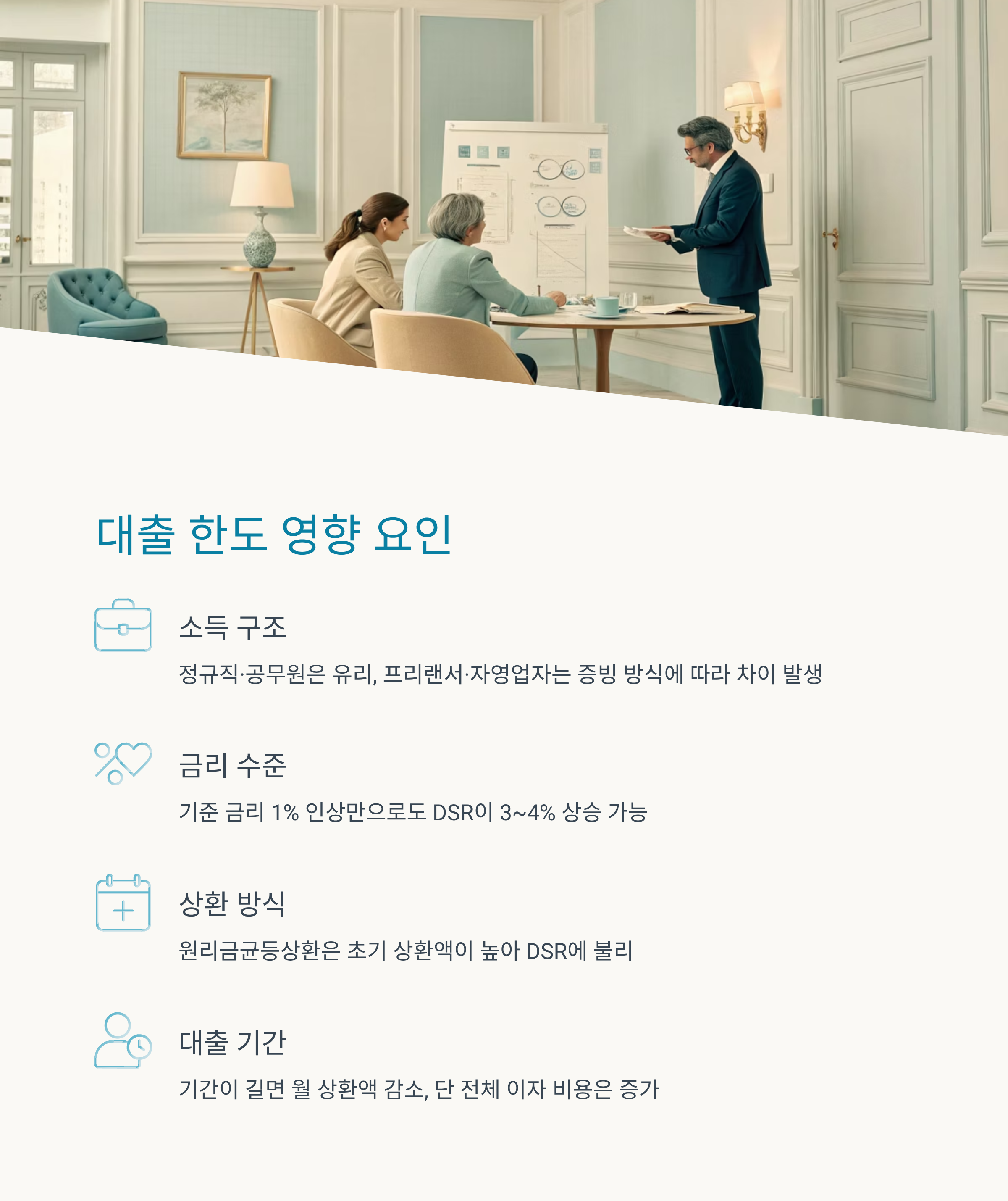기준 금리 1% 인상만으로도 DSR이 3~4% 상승할 수 있어요. - 상환 방식