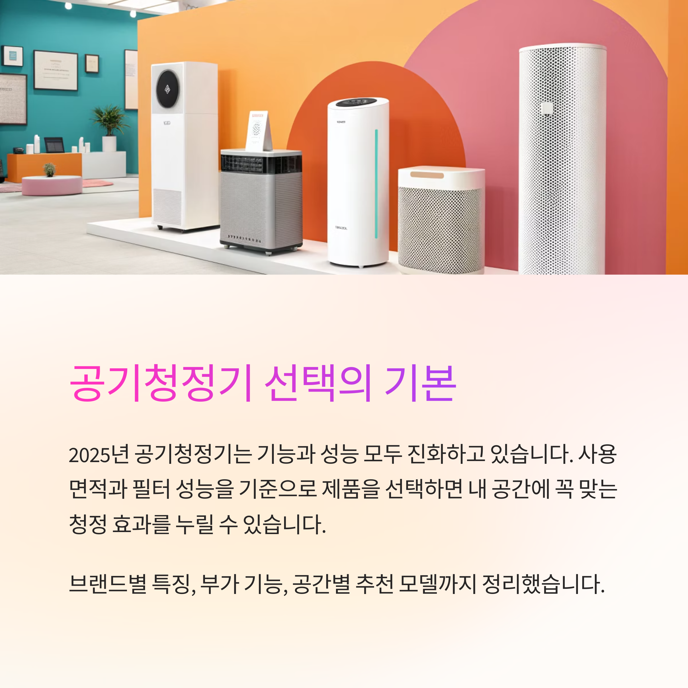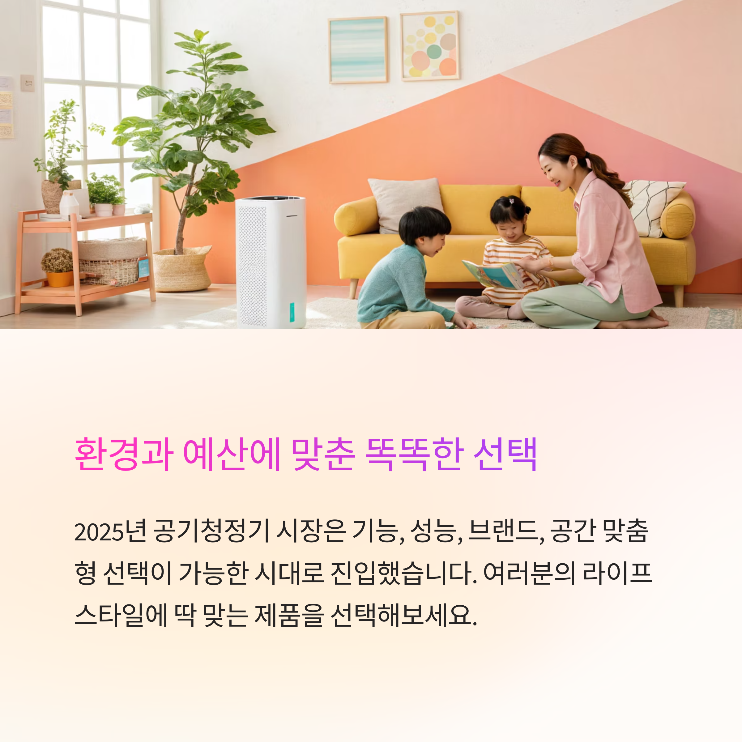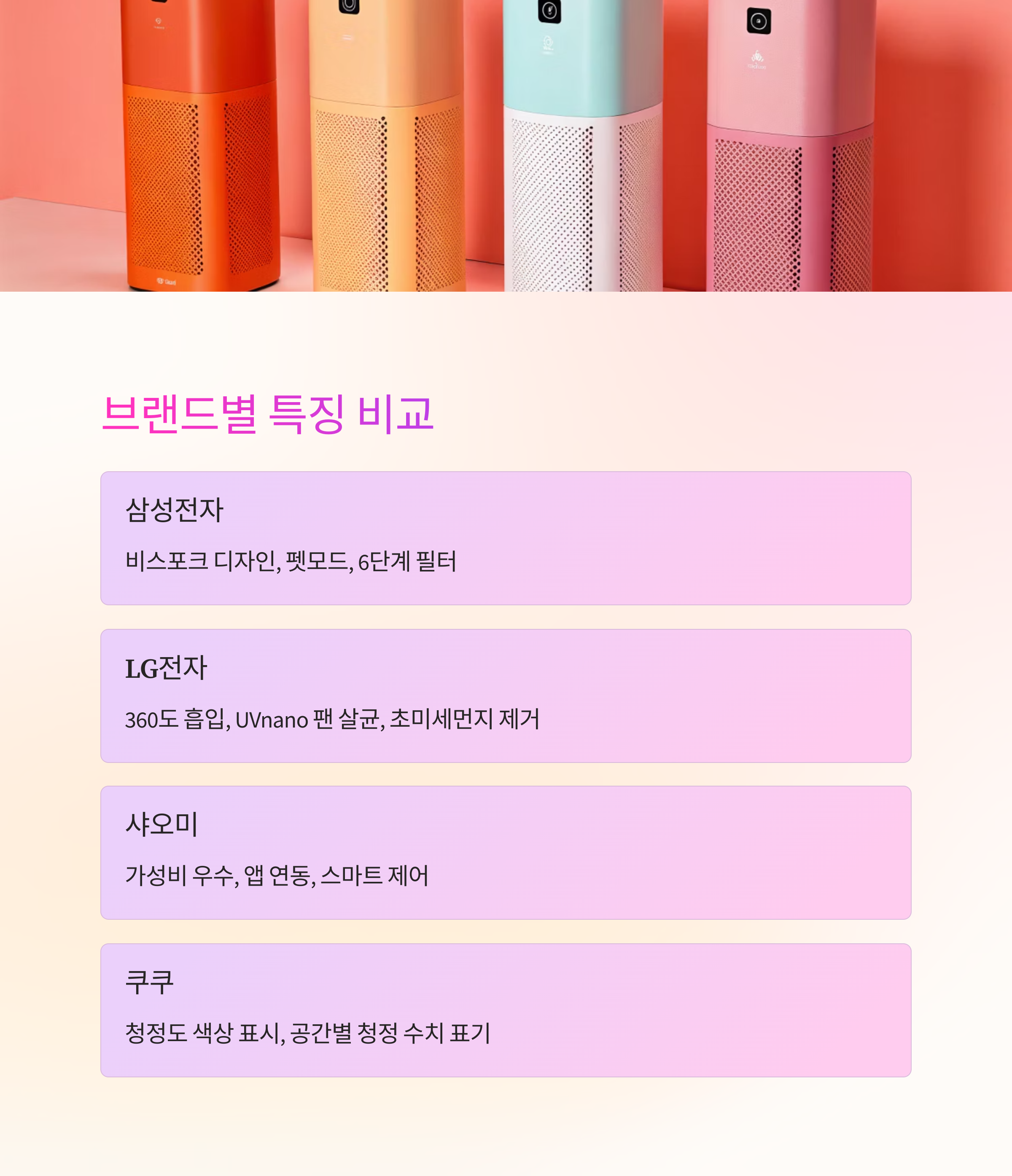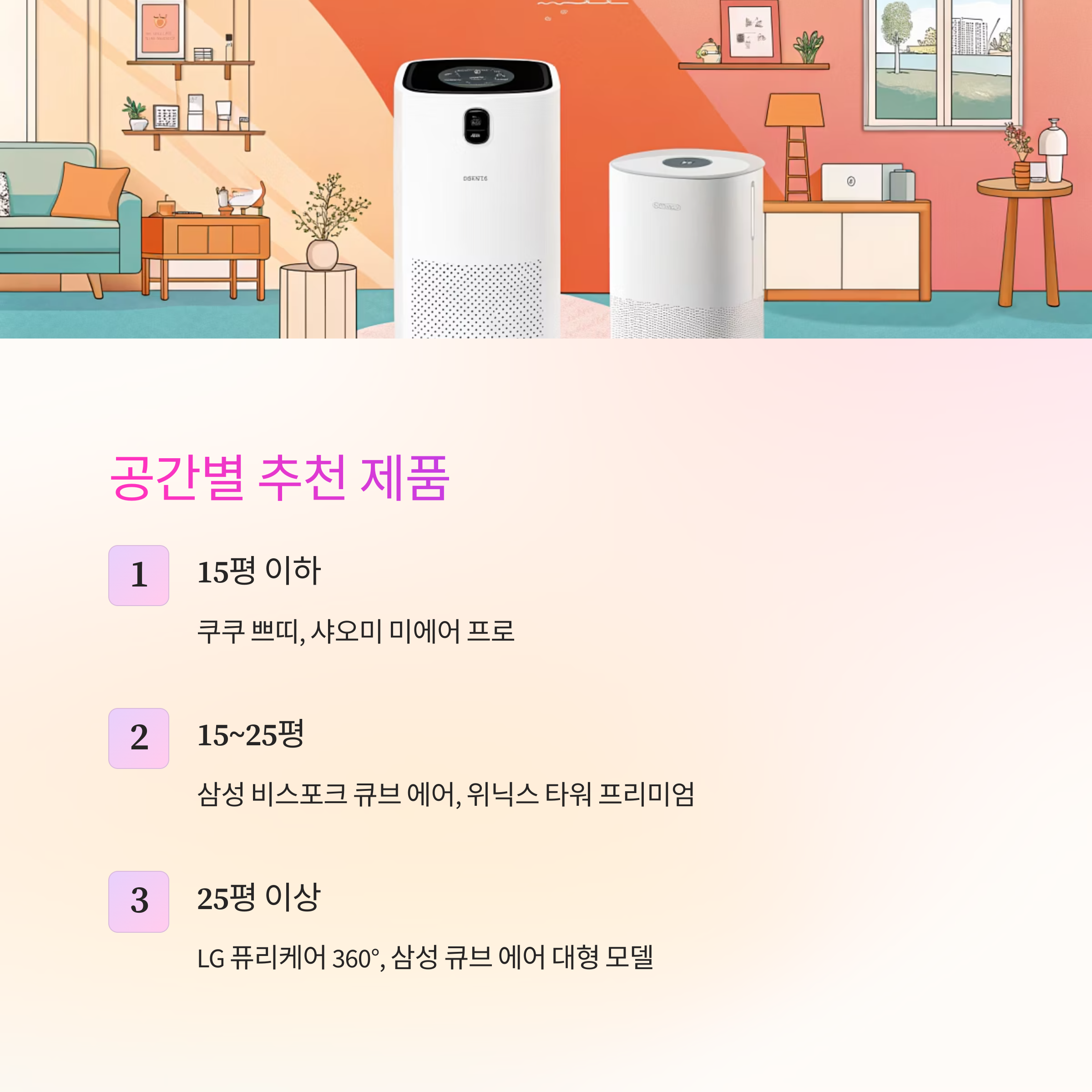 | 25평 이상 | LG 퓨리케어 360°, 삼성 큐브 에어 대형 모델 |