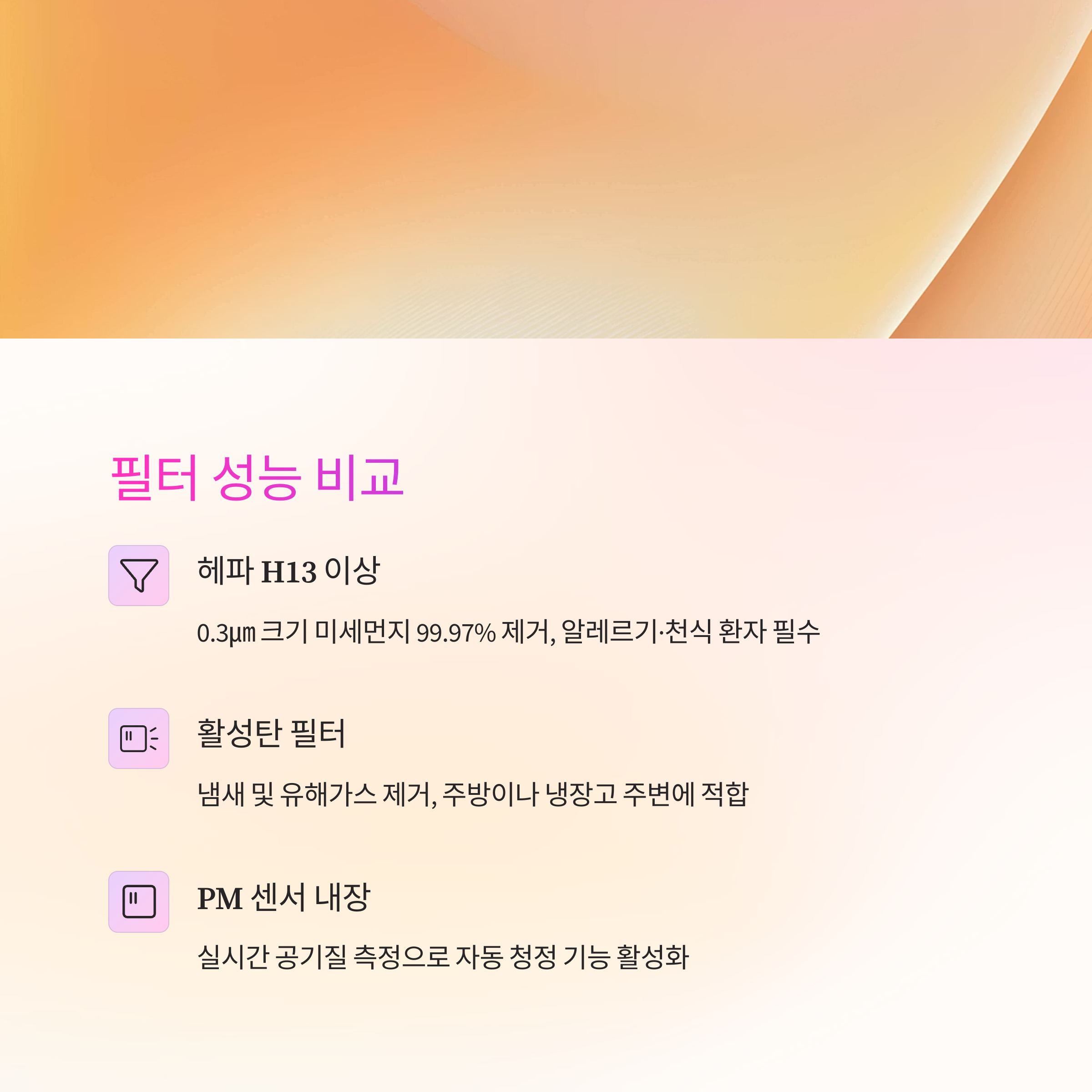 | 헤파 H13 이상 | 0.3㎛ 크기 미세먼지 99.97% 제거 | 알레르기·천식 환자 필수 |