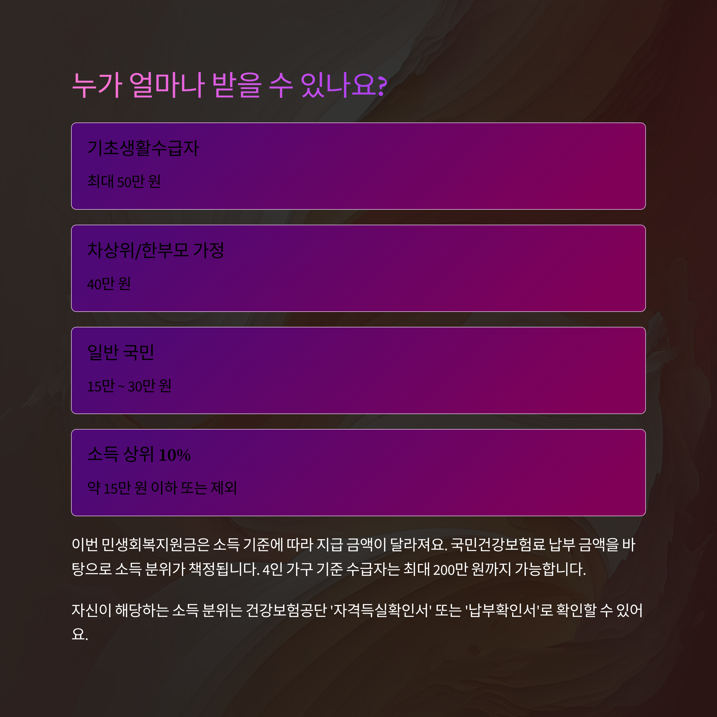 이번 민생회복지원금은 소득 기준에 따라 지급 금액이 달라져요.