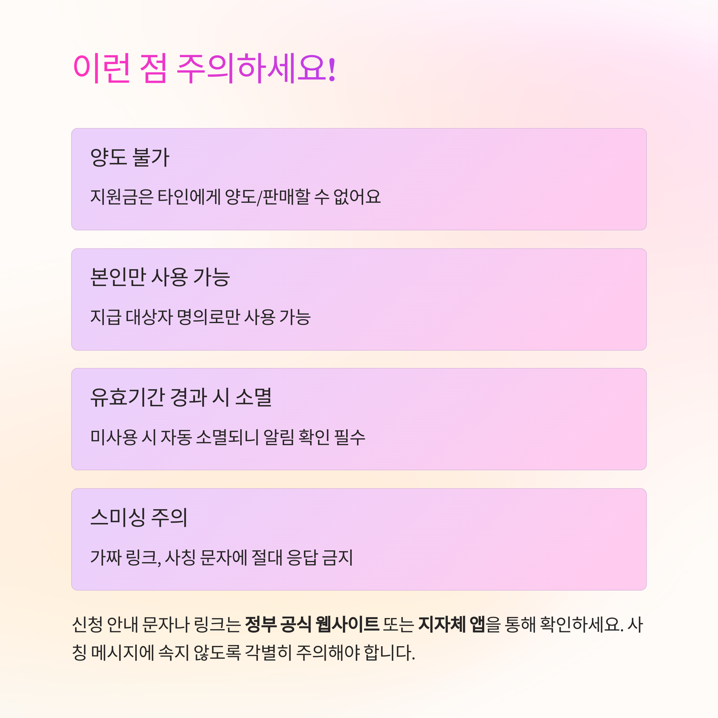| 양도 불가 | 지원금은 타인에게 양도/판매할 수 없어요 |