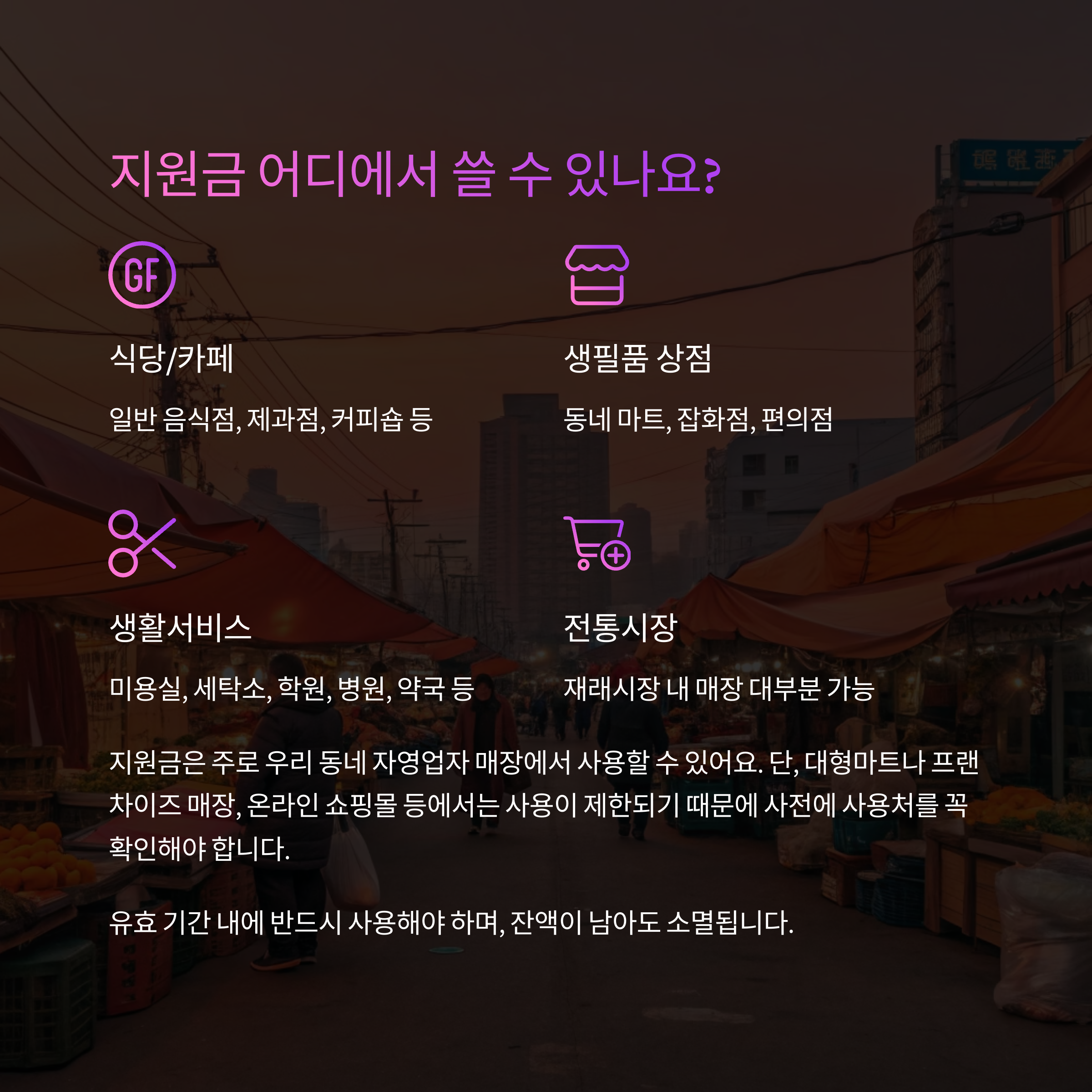 | 사용처 | 전통시장, 음식점, 병원, 미용실, 약국, 동네 마트 등 |