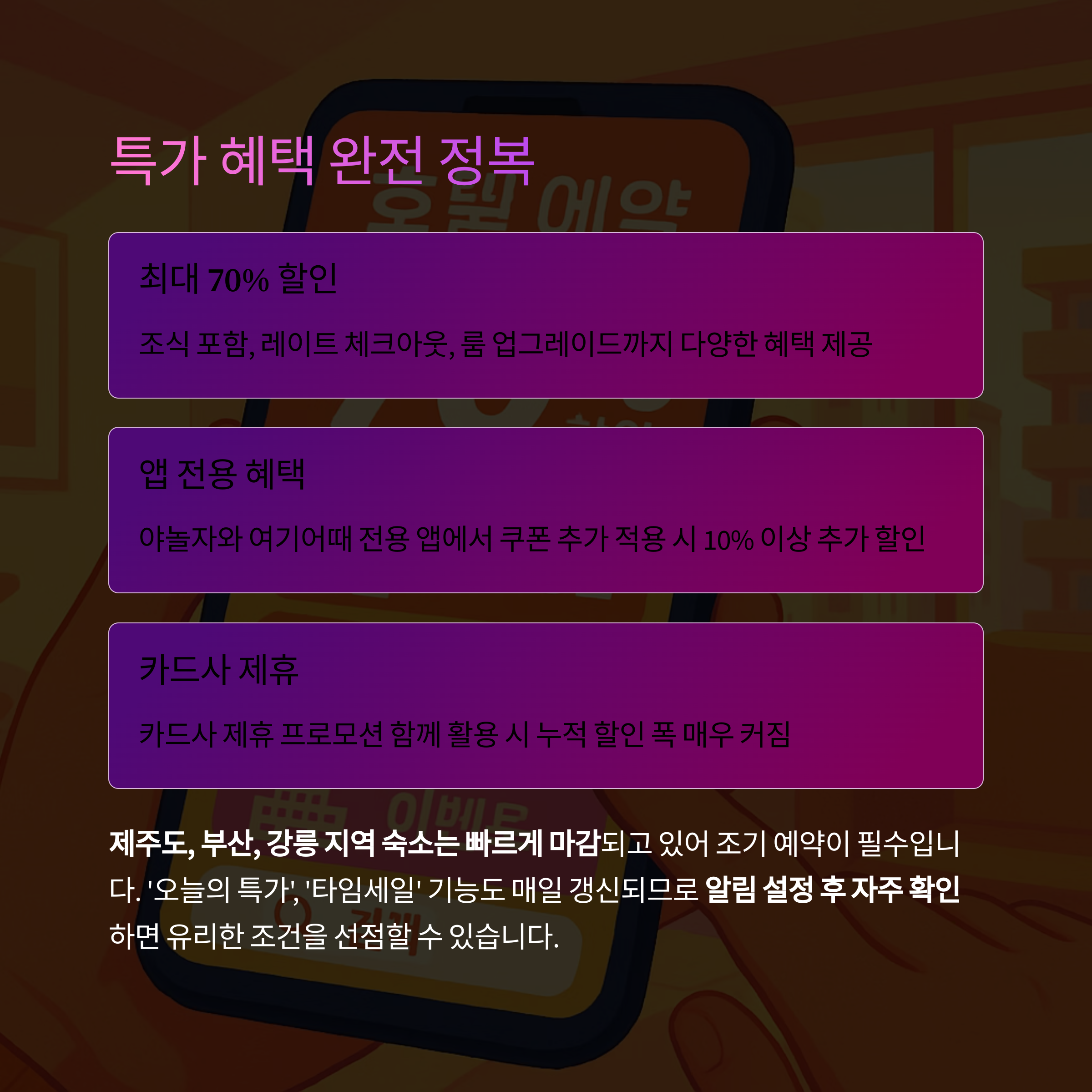 - 원하는 숙소는 하루 차이로 마감될 수 있으니, 할인 조건과 리뷰 꼼꼼히 확인