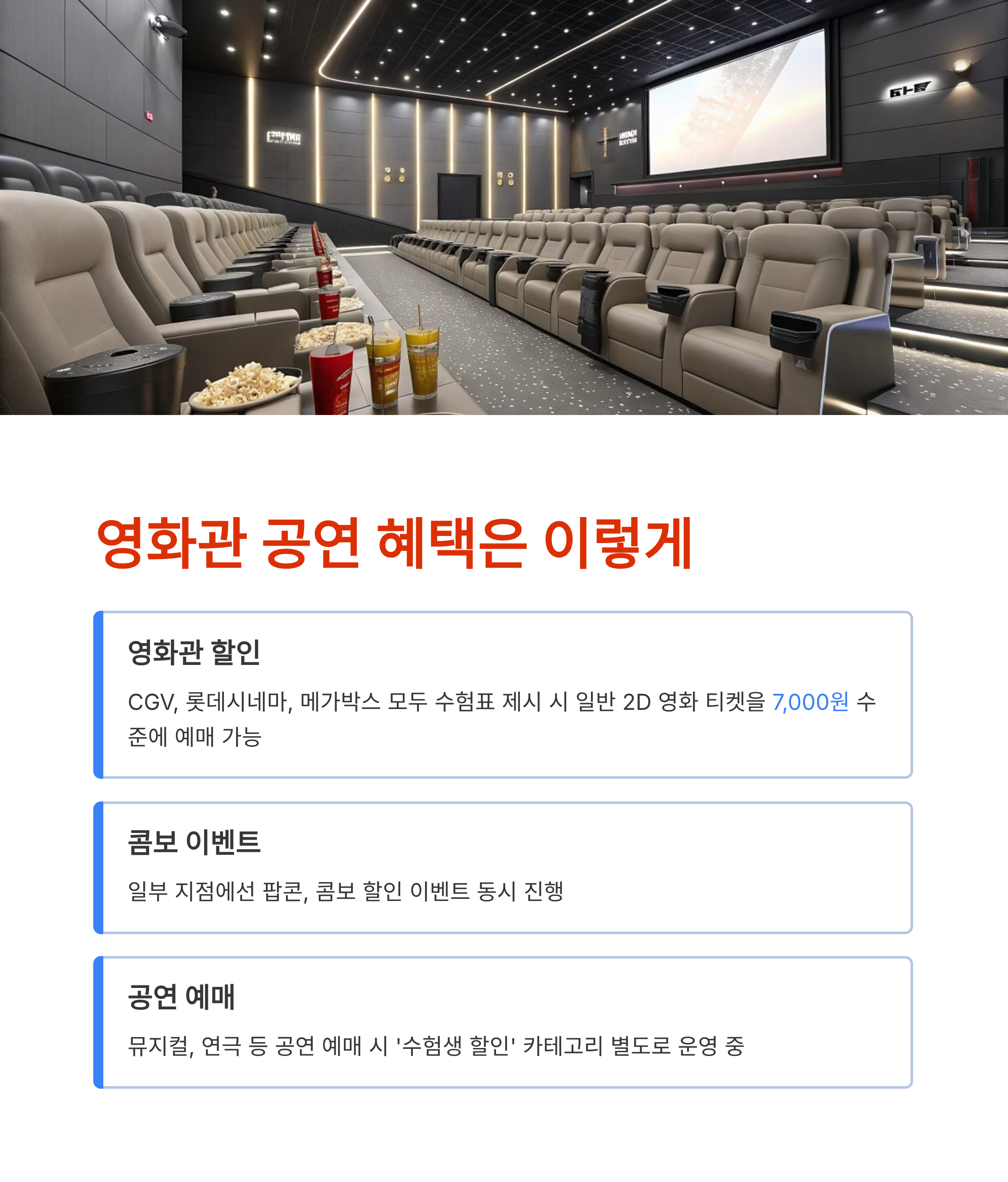 문화생활도 빼놓을 수 없죠. 전국 영화관 3사에서 수험생 전용 티켓과 콤보 할인 이벤트가 진행 중이에요.