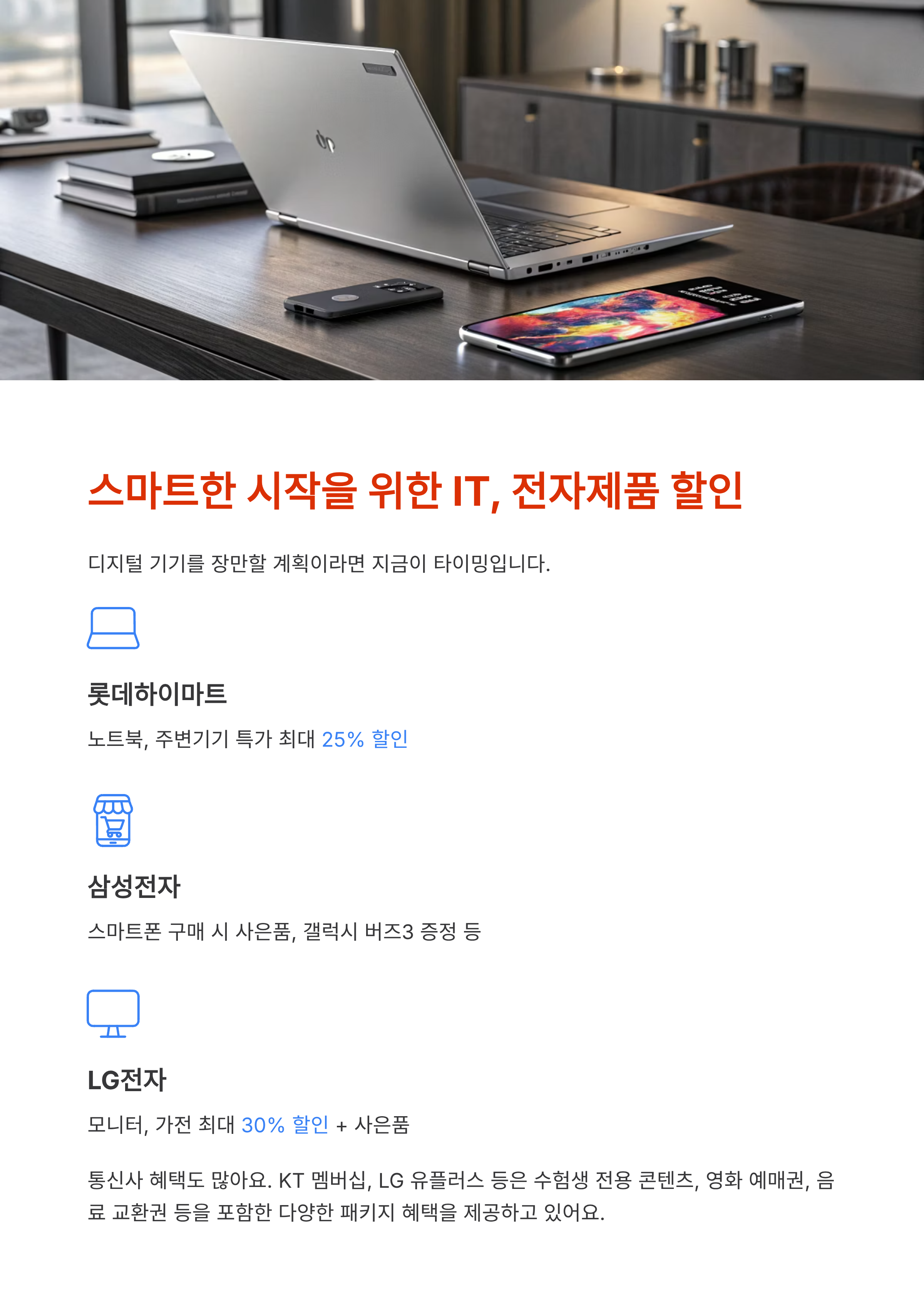 브랜드 혜택 내용 비고 롯데하이마트 노트북, 주변기기 특가 최대 25% 할인 삼성전자 스마트폰 구매 시 사은품 갤럭시 버즈3 증정 등 LG전자 모니터, 가전 최대 30% 할인 + 사은품