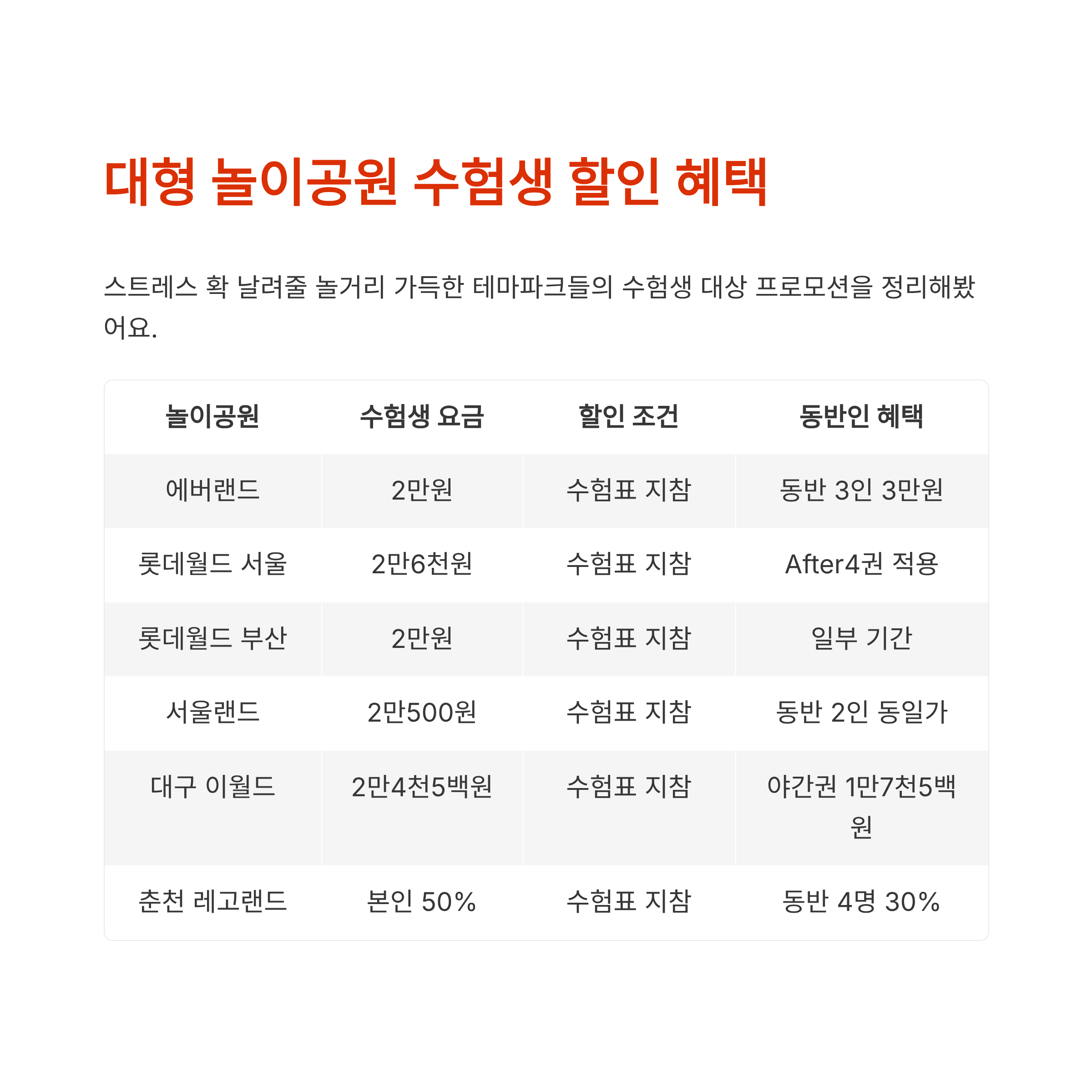 놀이공원 수험생 요금 할인 조건 동반인 혜택 에버랜드 2만원 수험표 지참 동반 3인 3만원 롯데월드 (서울) 2만6천원 수험표 지참 After4권도 적용 롯데월드 (부산) 2만원 수험표 지참 일부 기간 서울랜드 2만500원 수험표 지참 동반 2인 동일가 대구 이월드 종일 2만4천5백원 수험표 지참 야간권 1만7천5백원 춘천 레고랜드 본인 50% 수험표 지참 동반 4명 30%