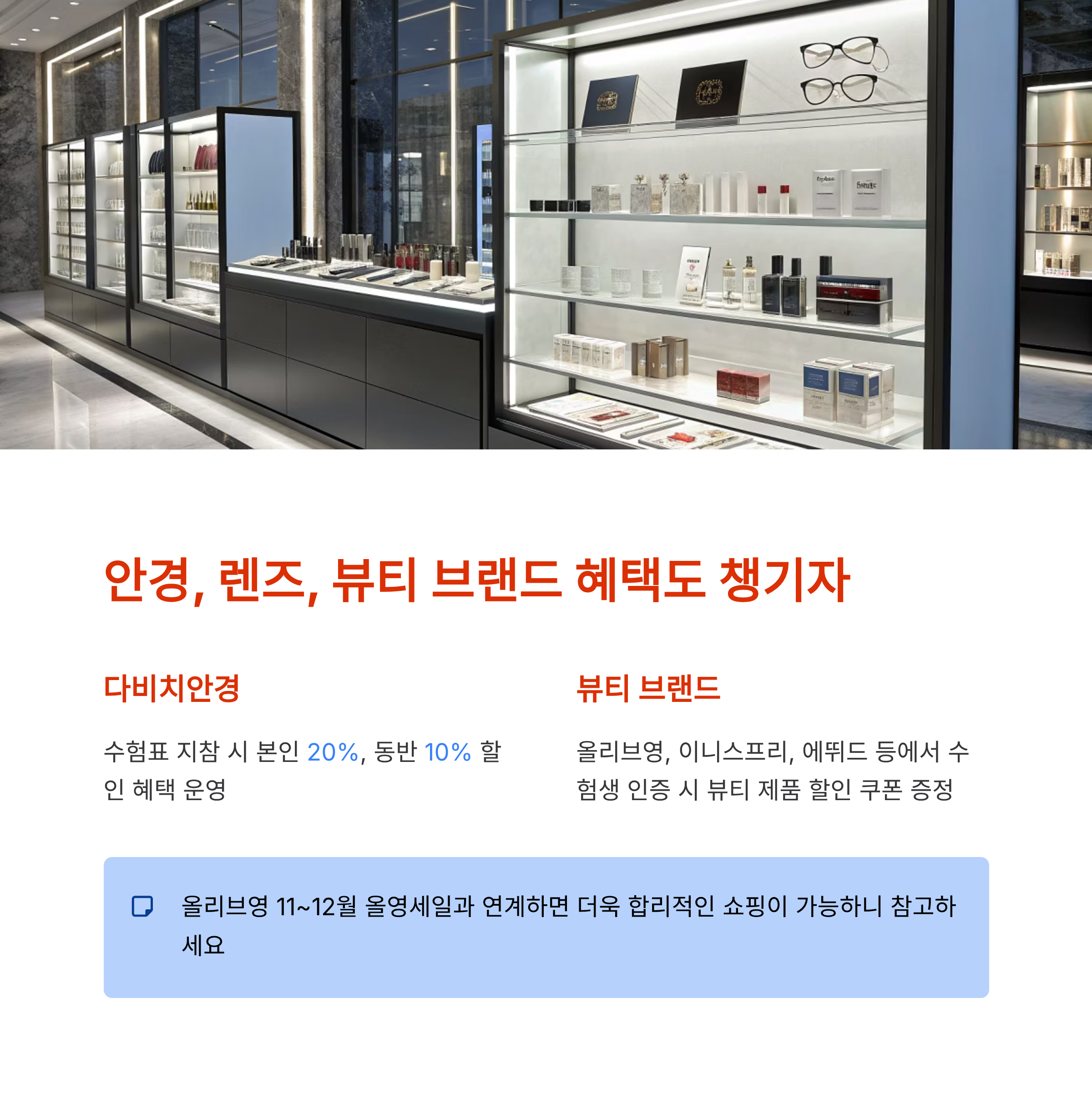 다비치안경에서는 수험표 지참 시 본인 20%, 동반 10% 할인 혜택을 운영합니다. 올리브영, 이니스프리, 에뛰드 등에서는 수험생 인증 시 뷰티 제품 할인 쿠폰을 증정하거나, 특별 기획 세트를 출시하는 경우도 있어요.