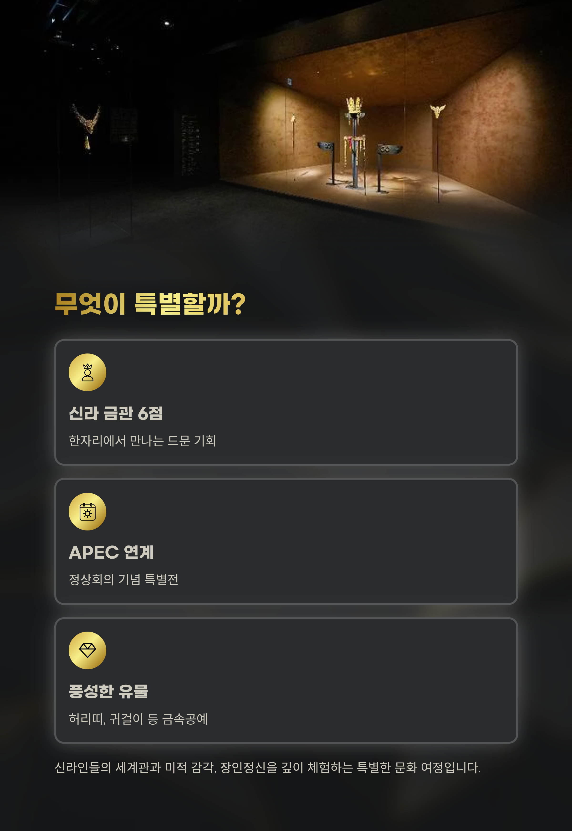 신라 금관 특별전은 단순한 유물 전시를 넘어 찬란한 신라의 역사와 문화를 눈으로, 귀로, 마음으로 체험할 수 있는 드문 기회입니다. APEC 정상회의와 맞물려 세계적인 행사로 격상된 만큼, 의미도 감동도 큽니다.