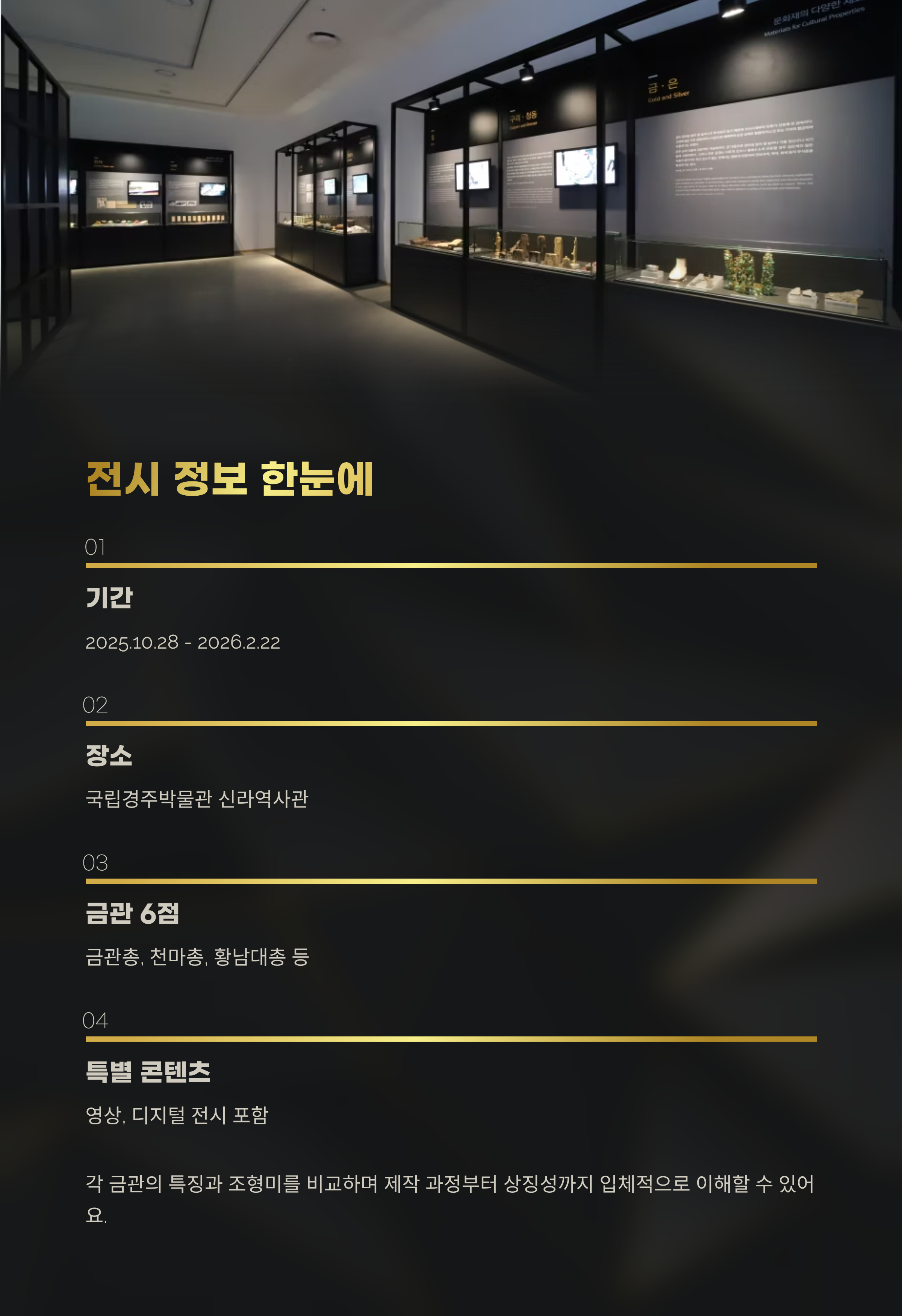 2025년 10월 28일부터 2026년 2월 22일까지 국립경주박물관 신라역사관에서 열리는 이번 전시는 APEC 정상회의와 연계된 공식 문화행사로, 역사적 의미가 깊어요. 금관총, 천마총, 황남대총 등 대표 고분에서 출토된 금관 6점이 한자리에 모이며, 각각의 금관이 가진 특징과 조형미를 비교해보는 것도 전시의 재미 중 하나랍니다.