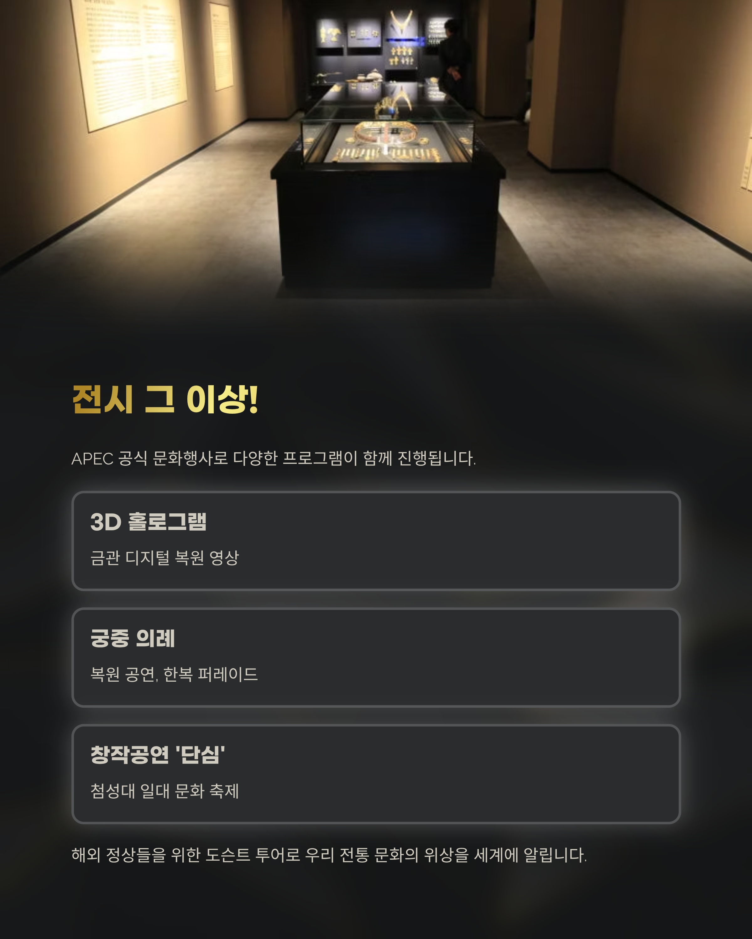 이번 전시는 단순히 유물만 보는 행사가 아닙니다. APEC 공식 문화행사로 지정되면서 다양한 문화 프로그램이 함께 진행돼요. 예를 들어, 금관을 디지털로 복원한 3D 홀로그램 영상은 꼭 보셔야 할 콘텐츠예요. 영상으로 보는 금관의 입체감은 실물과는 또 다른 감동을 줍니다.