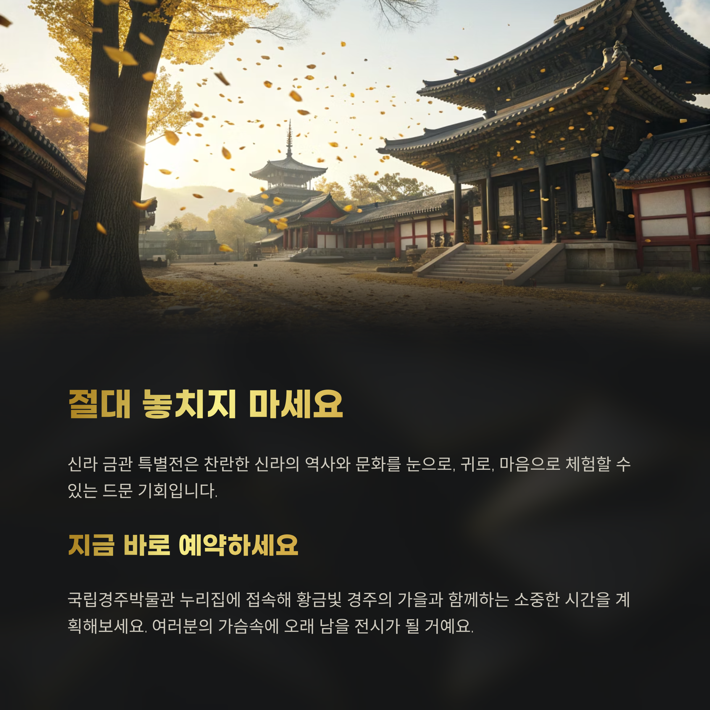 지금 바로 국립경주박물관 누리집에 접속해 예약하시고, 황금빛 경주의 가을과 함께하는 소중한 시간을 계획해보세요. 여러분의 가슴속에 오래 남을 전시가 될 거예요.