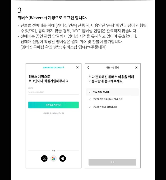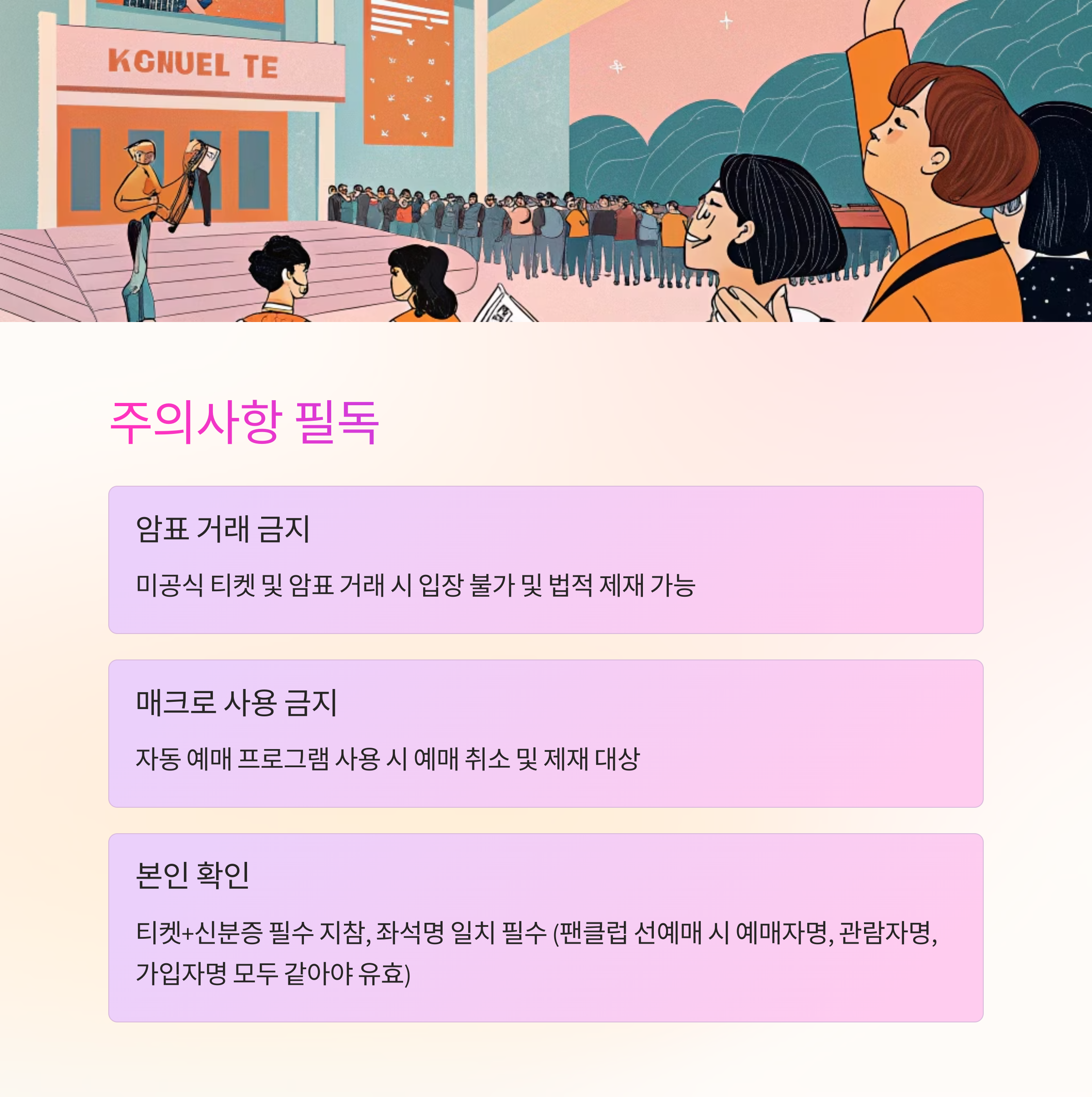 - 좌석명 일치 필수: 팬클럽 선예매 시 예매자명, 관람자명, 가입자명 모두 같아야 유효