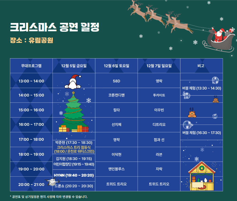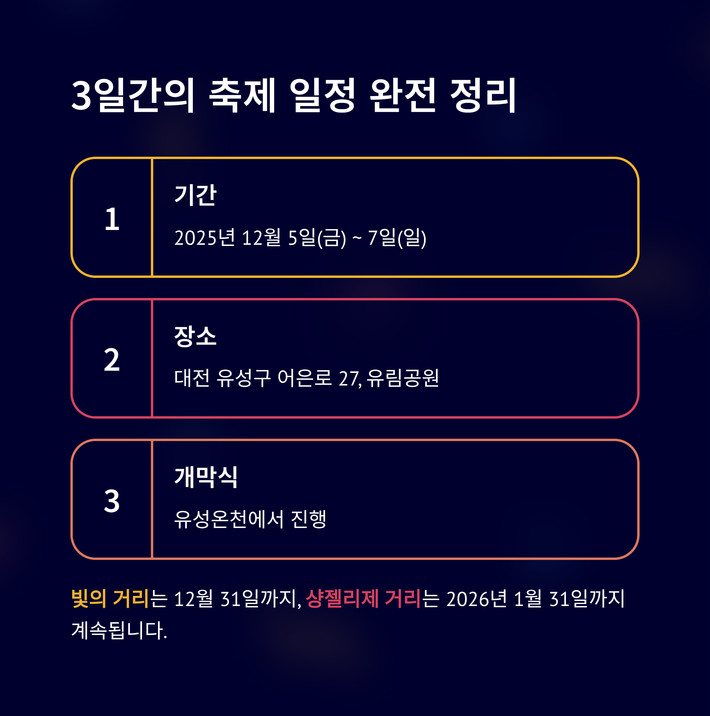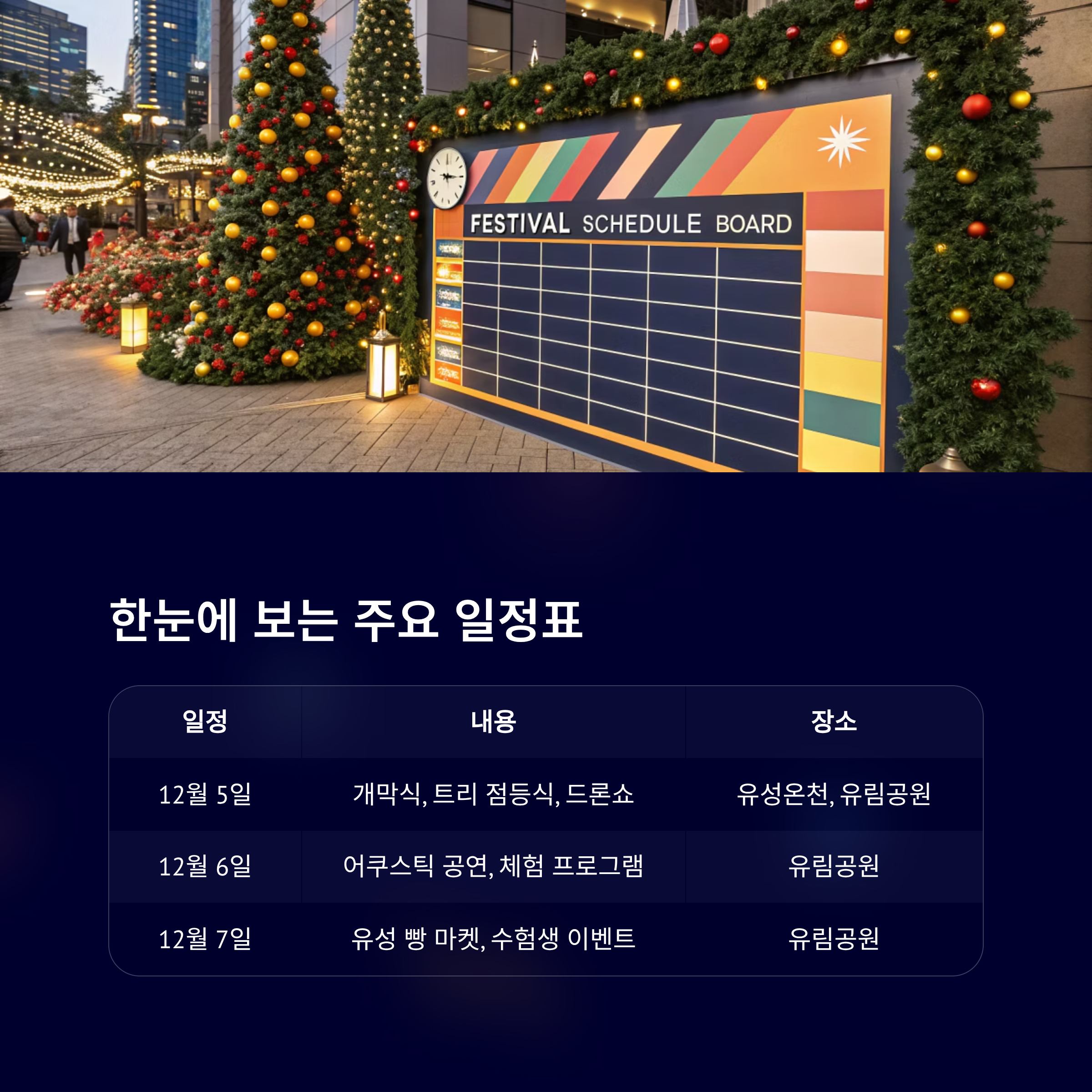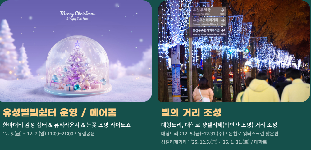 | 12월 5일 | 개막식, 트리 점등식, 드론쇼 | 유성온천, 유림공원 |