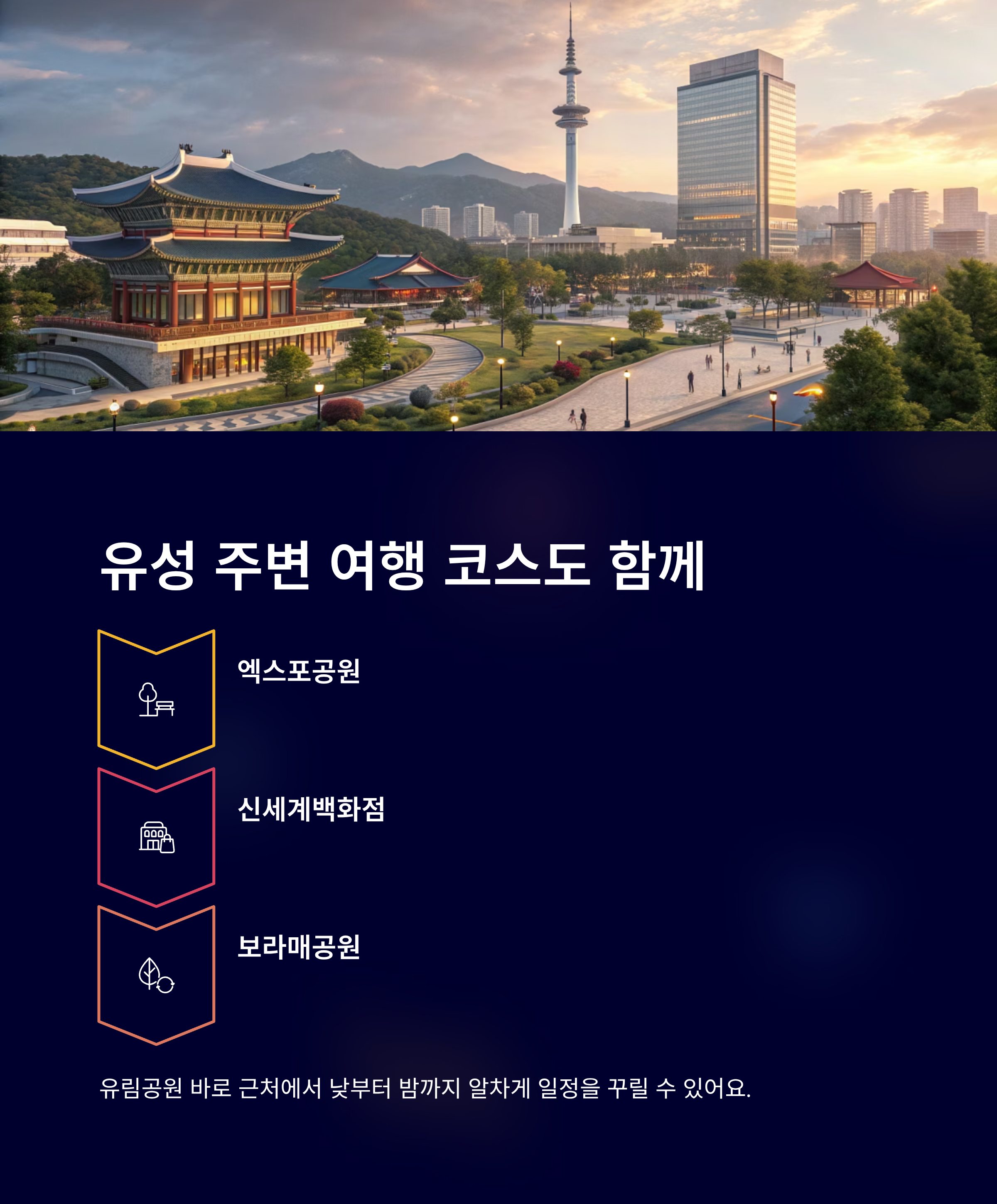 유림공원 바로 근처엔 엑스포공원, 신세계백화점, 보라매공원 등이 있어 낮부터 밤까지 알차게 일정을 꾸릴 수 있어요.