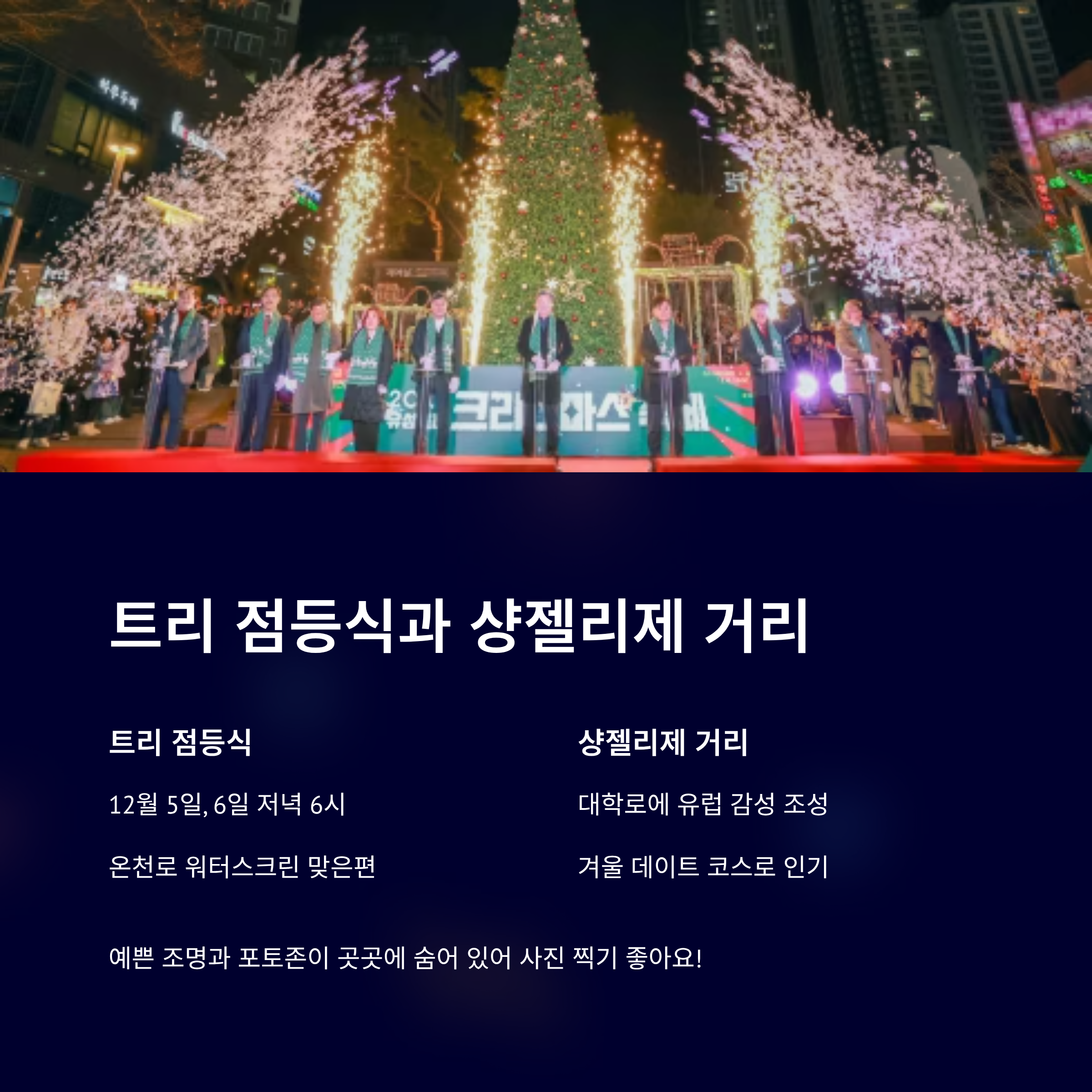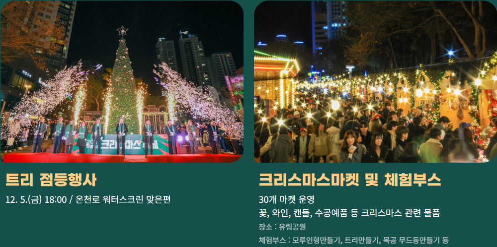 트리 점등식은 12월 5일과 6일 저녁 6시, 온천로 워터스크린 맞은편에서 진행됩니다.
