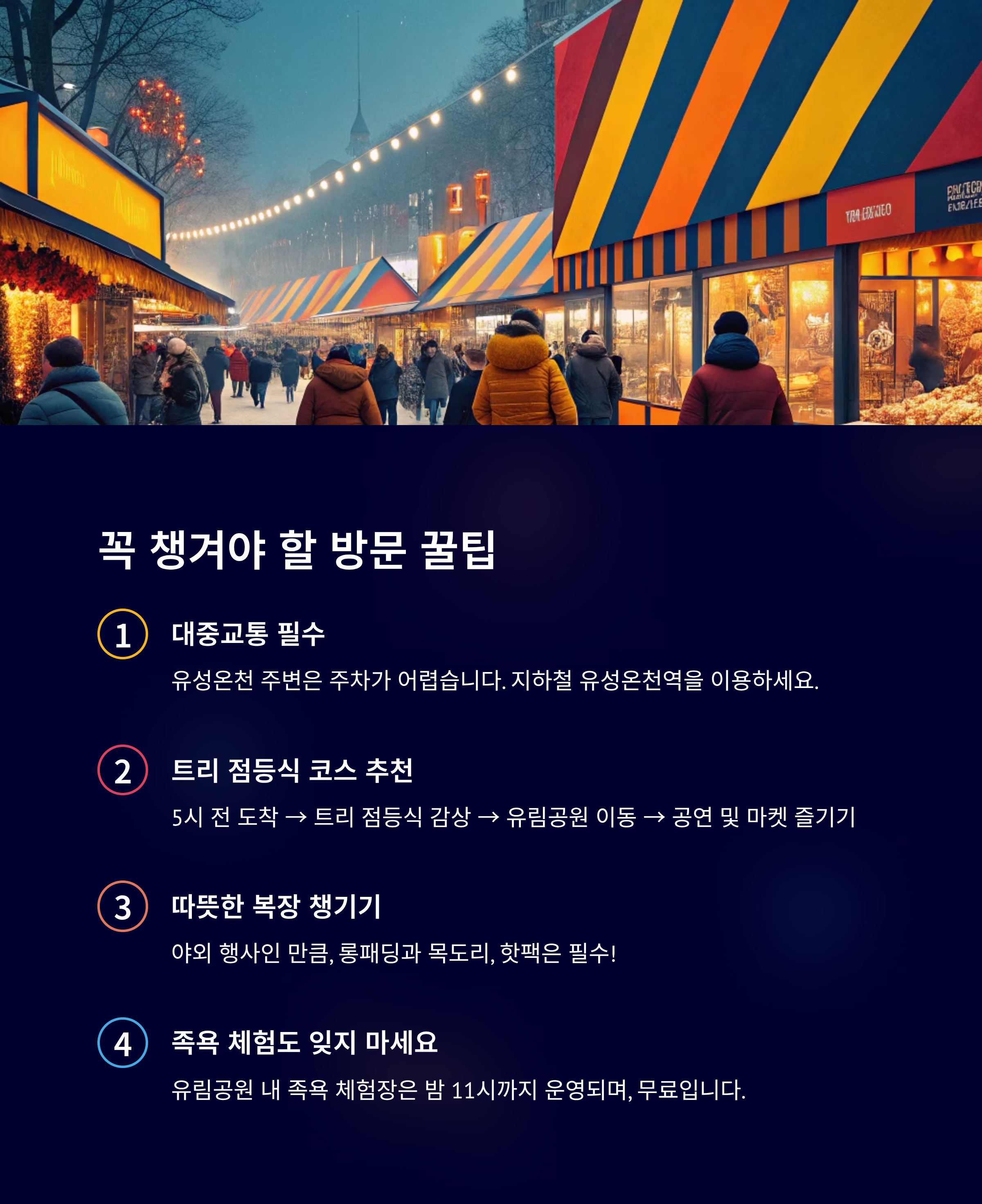 5시 전 도착 → 트리 점등식 감상 → 유림공원 이동 → 공연 및 마켓 즐기기 - 따뜻한 복장 챙기기