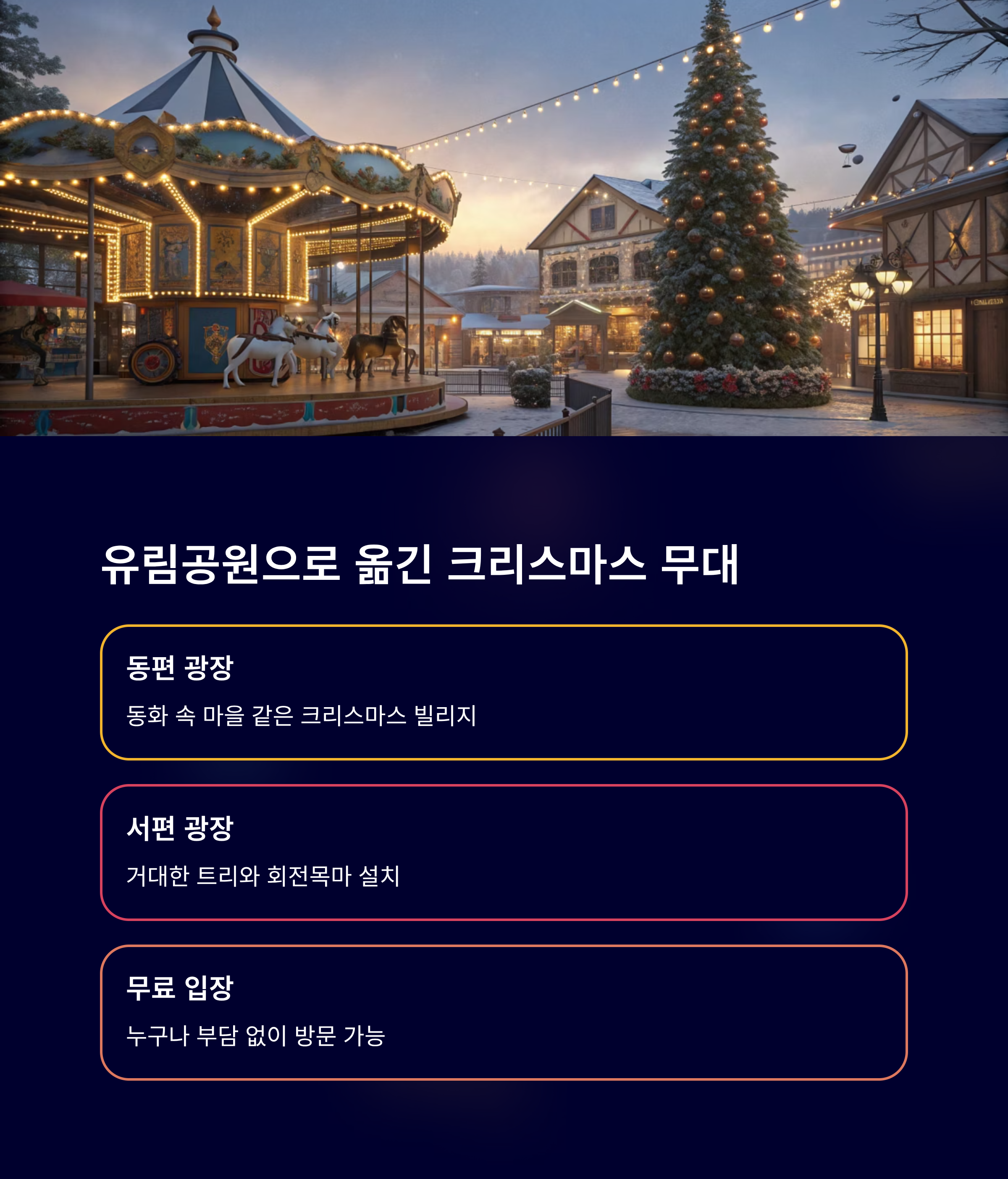 동편 광장에는 동화 속 마을 같은 크리스마스 빌리지가, 서편 광장엔 거대한 트리와 회전목마가 설치됩니다. 입장료는 없습니다. 누구나 부담 없이 방문해, 낭만적인 겨울 풍경을 만끽할 수 있어요.