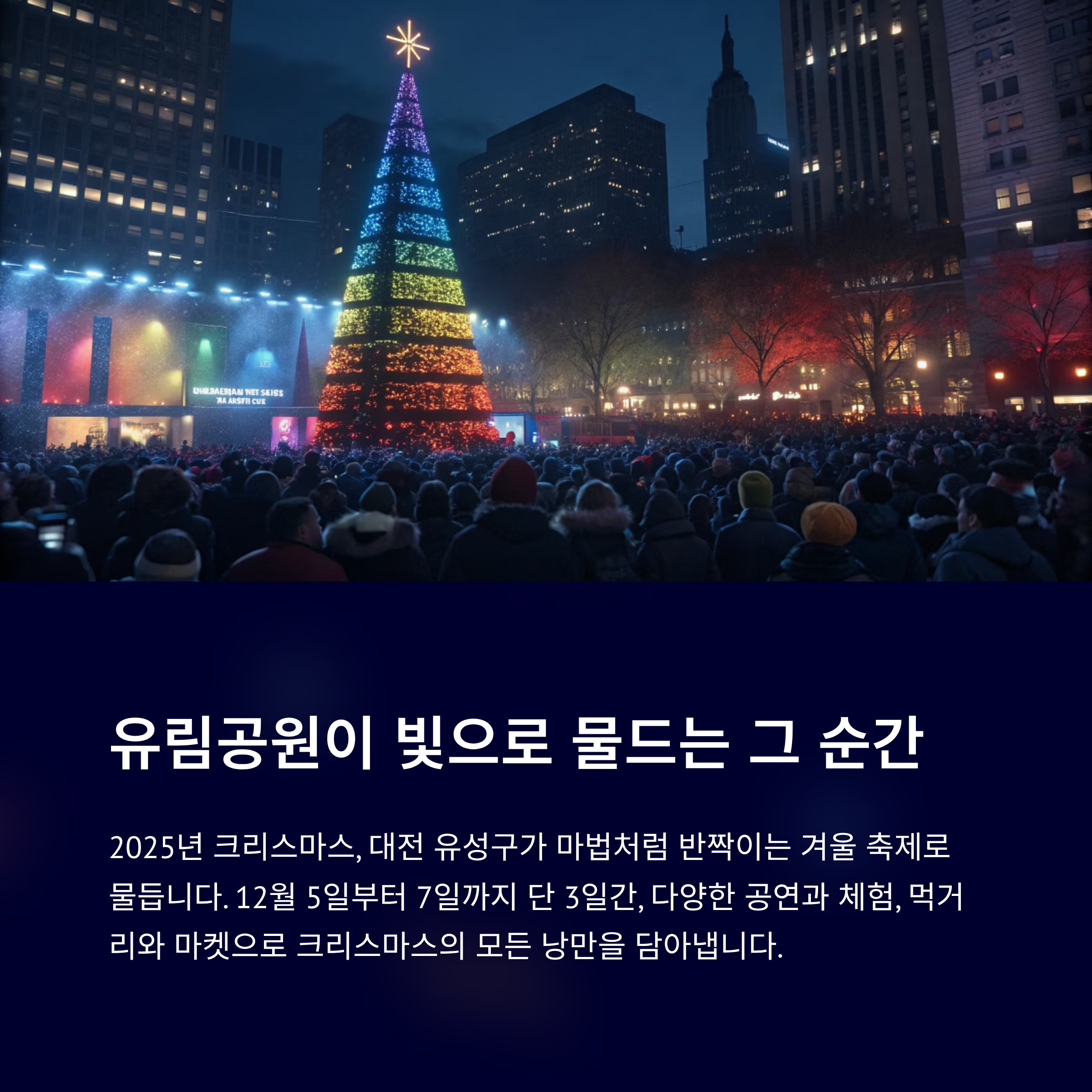 2025년 크리스마스, 대전 유성구가 마법처럼 반짝이는 겨울 축제로 물듭니다. 온천로에서 유림공원으로 무대를 옮긴 이번 축제는 단 3일, 12월 5일부터 7일까지 열리며 다양한 공연과 체험, 먹거리와 마켓으로 크리스마스의 모든 낭만을 담아냅니다. 가족, 친구, 연인과 함께 특별한 추억을 남기기에 딱 좋은 기회! 지금 바로 일정을 체크하고 유성의 겨울 속으로 들어가 보세요.