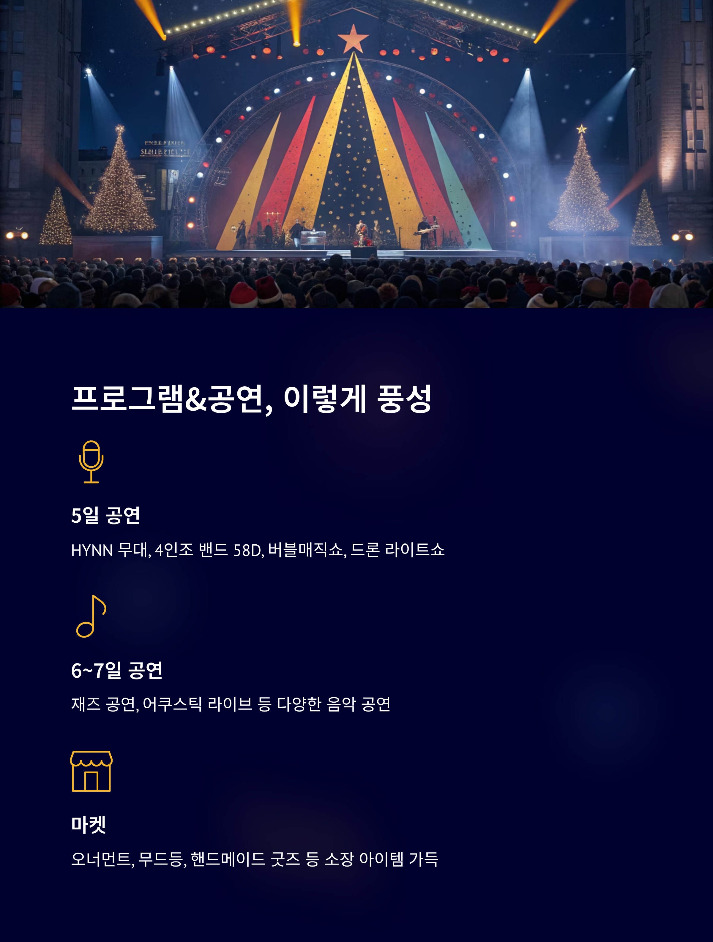 | 어떤 프로그램이 있나요? | 공연, 마켓, 체험, 트리 점등식, 드론쇼 등 |