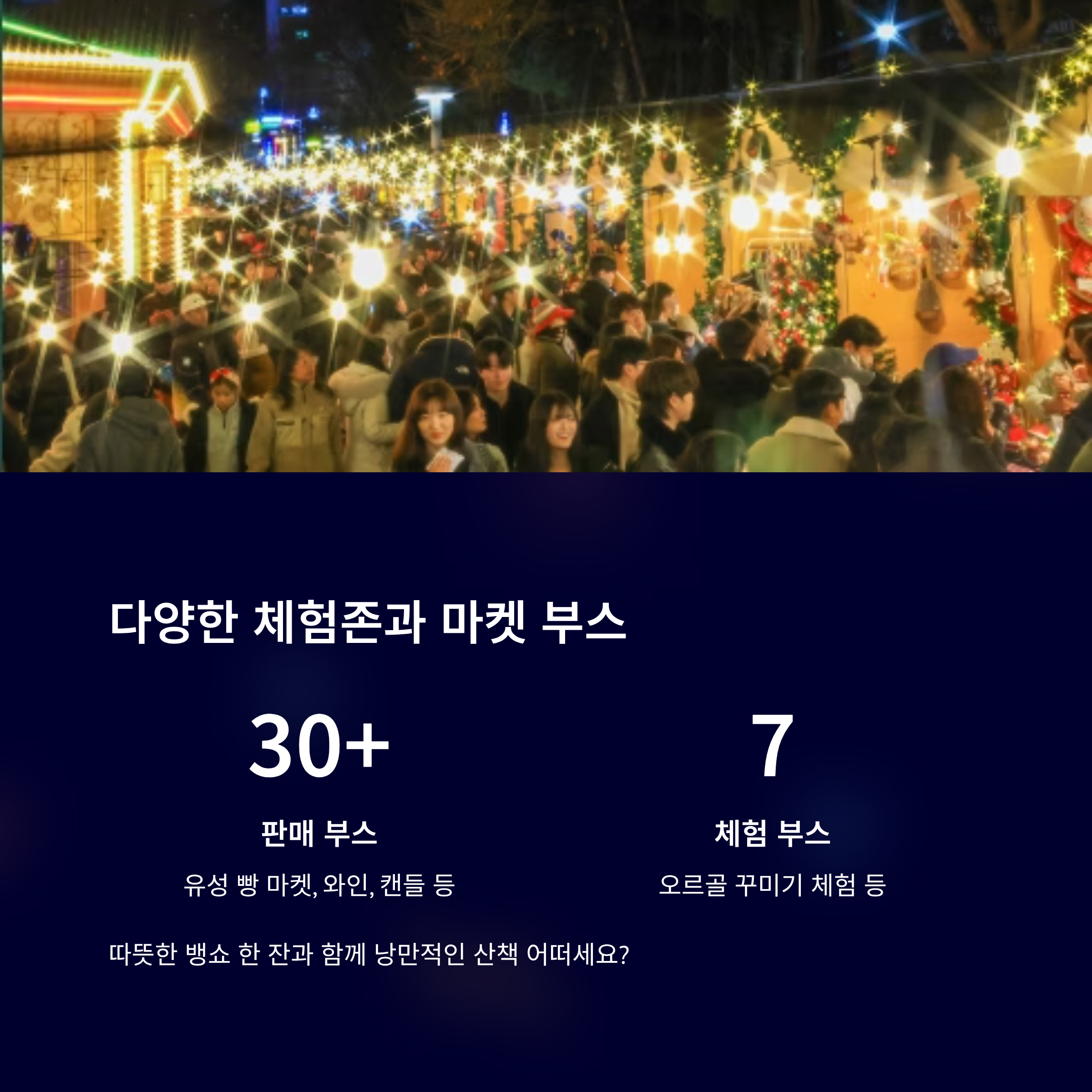 30개 이상의 판매 부스, 7개의 체험 부스가 마련되어 있어요. 따뜻한 뱅쇼 한 잔과 함께 낭만적인 산책 어떠세요?