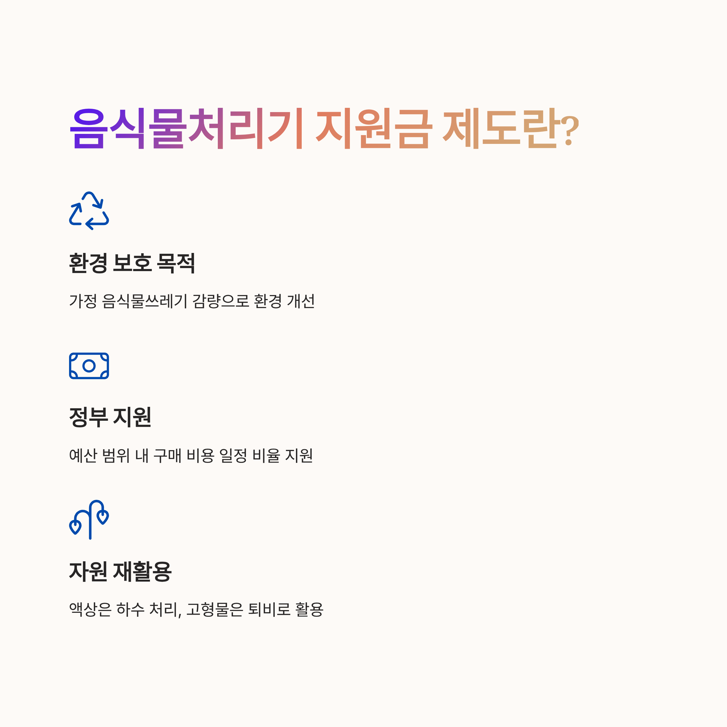 음식물처리기 지원금은 가정에서 배출되는 음식물쓰레기를 줄이고 환경 보호에 기여하기 위해 운영되는 제도입니다. 정부와 각 지자체는 예산 범위 내에서 처리기 구매 비용의 일정 비율을 지원합니다. 액상 배출물은 하수 처리, 고형 배출물은 퇴비 등으로 활용할 수 있어 생활 환경 개선에도 도움이 됩니다.
