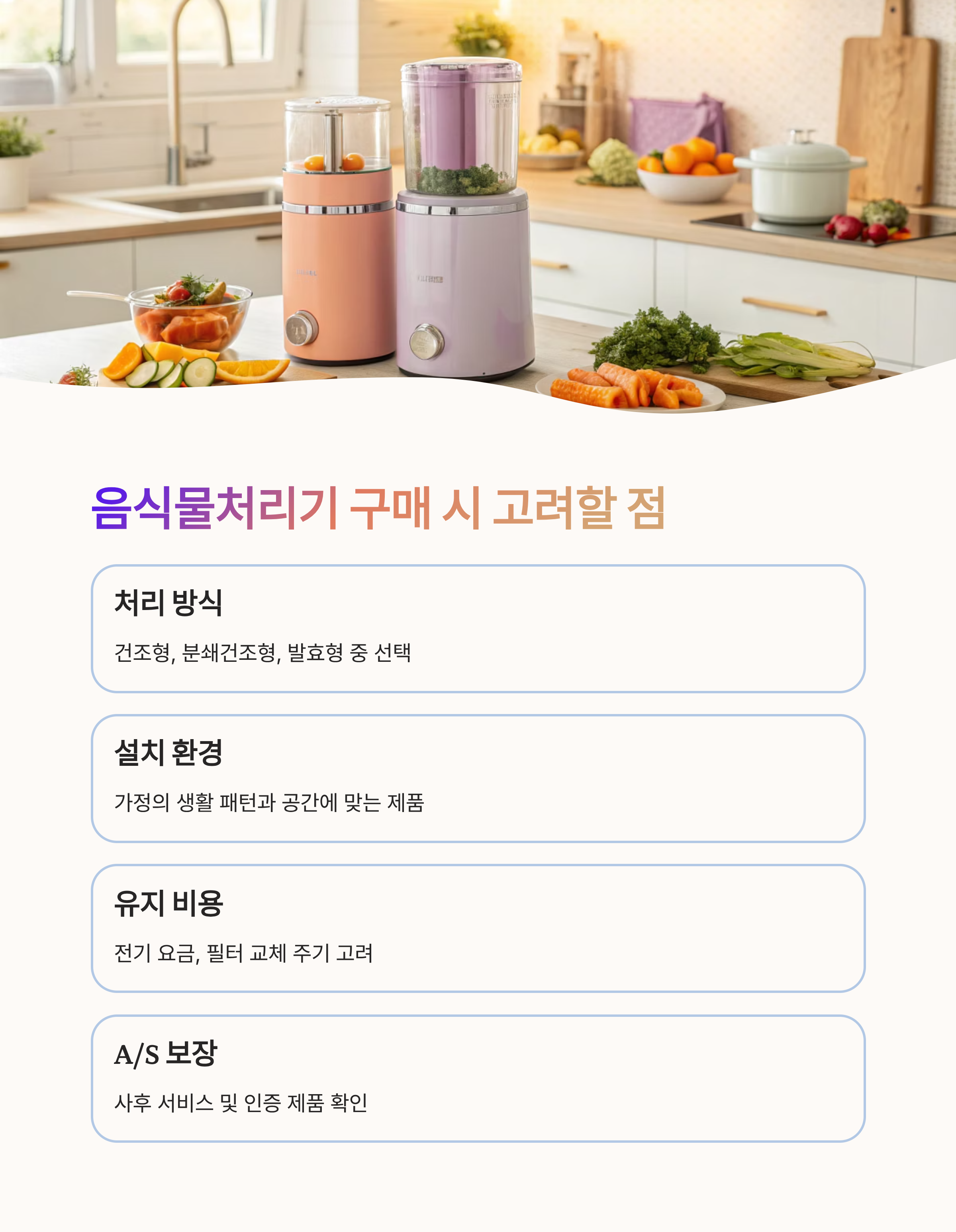 음식물 처리 방식은 건조형, 분쇄건조형, 발효형 등 다양합니다. 가정의 생활 패턴과 설치 환경에 맞는 제품을 고르는 것이 중요합니다.