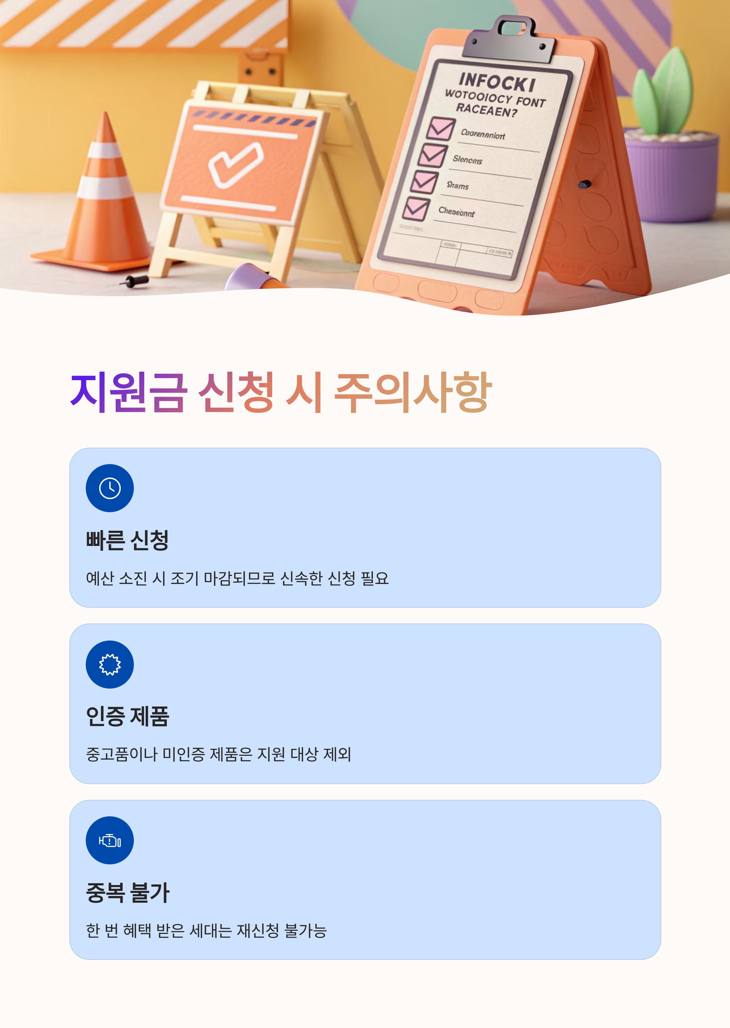 중고 제품이나 인증이 없는 제품은 지원 대상에서 제외되며, 한 번 혜택을 받은 세대는 중복 신청이 불가능합니다.