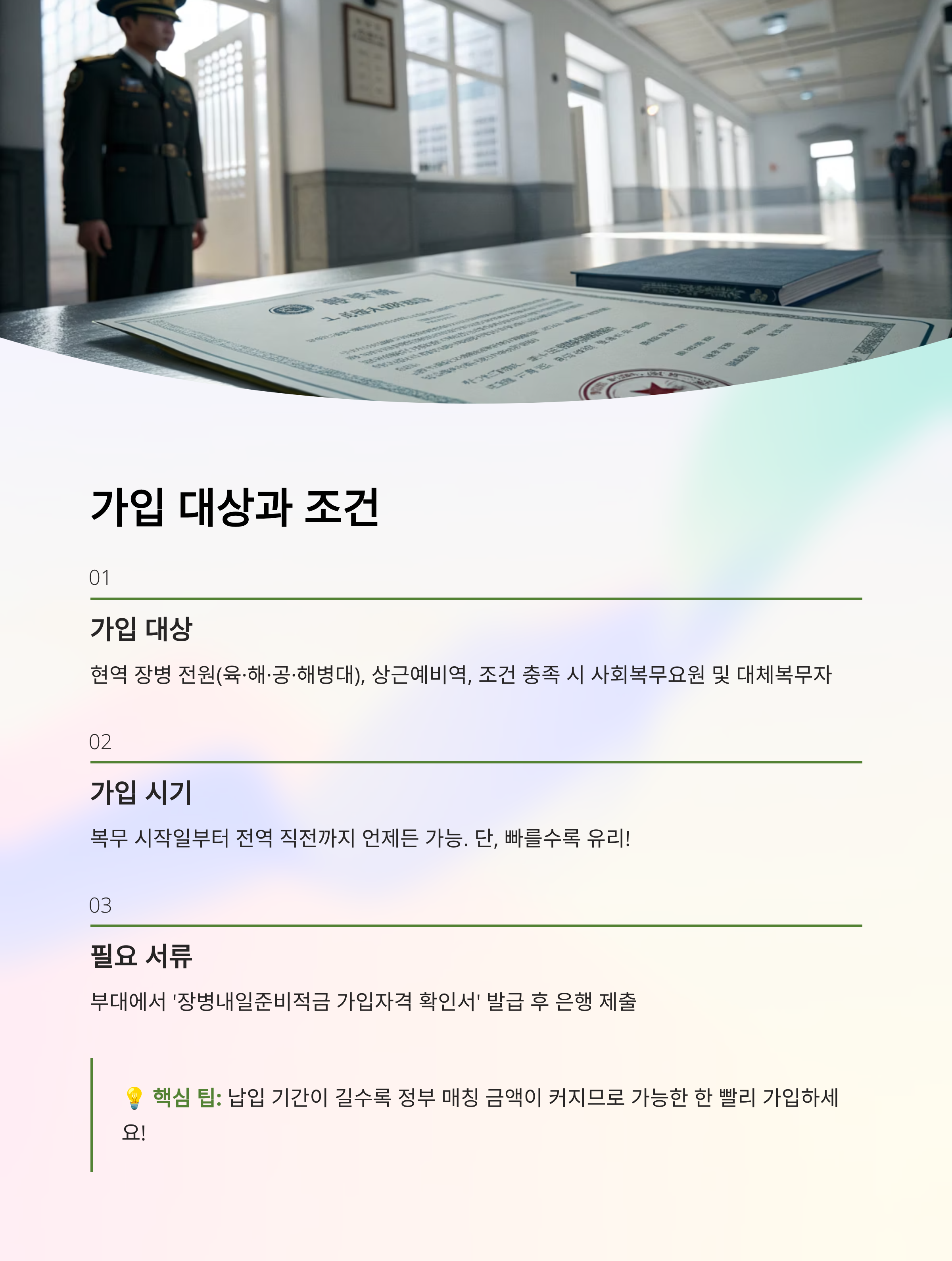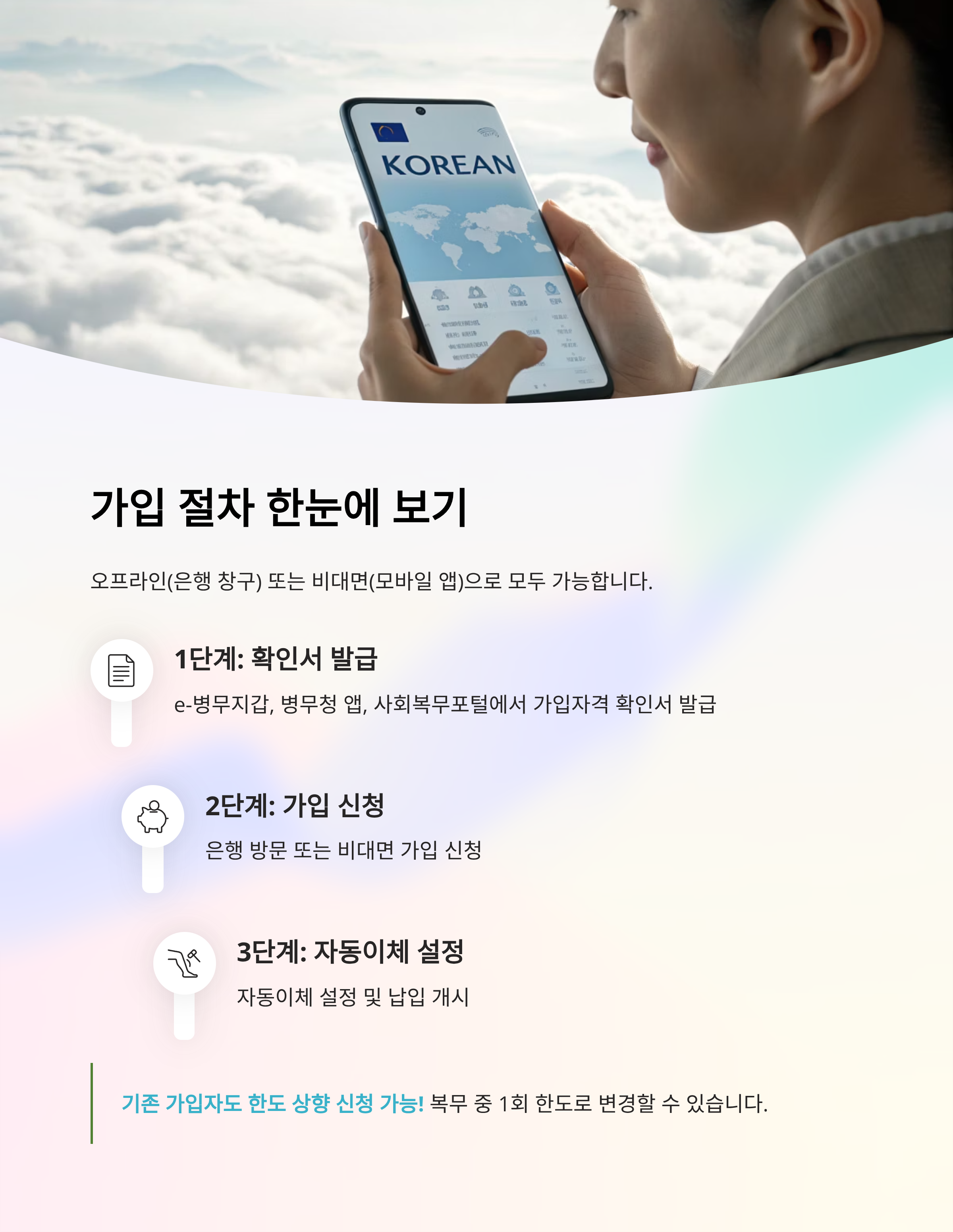 가입 대상은 현역 장병 전원(육·해·공·해병대), 상근예비역, 그리고 일정 조건을 충족하는 사회복무요원 및 대체복무자입니다. 복무 시작일부터 전역 직전까지 언제든 가입 가능하지만, 납입 기간이 길수록 정부 매칭 금액이 커지기 때문에 가능한 한 빨리 가입하는 것이 유리합니다.