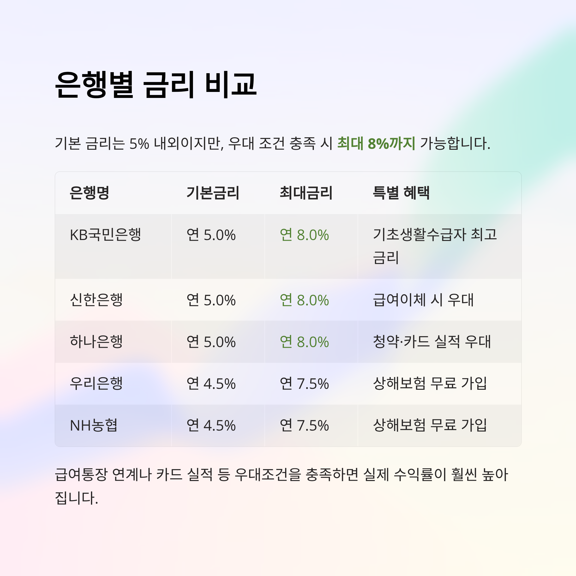 은행별로 금리와 우대 조건이 조금씩 다릅니다. 기본 금리는 대부분 5% 내외이지만, 우대 조건을 충족하면 최대 8%까지 올라갈 수 있습니다.