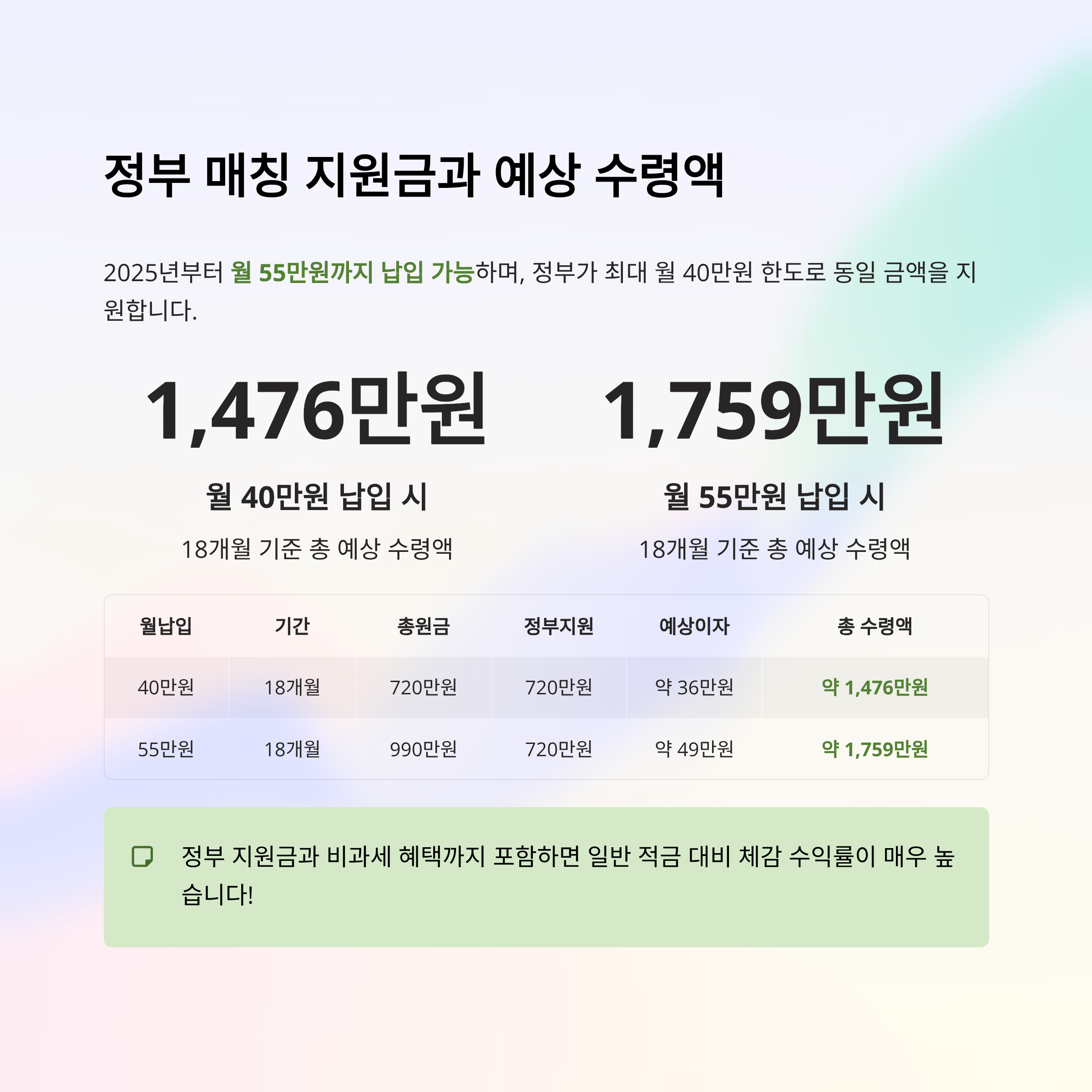 2025년부터는 월 55만원까지 납입 가능하며, 정부가 최대 월 40만원 한도로 동일 금액을 지원합니다. 18개월 기준 만기 수령액은 다음과 같습니다.