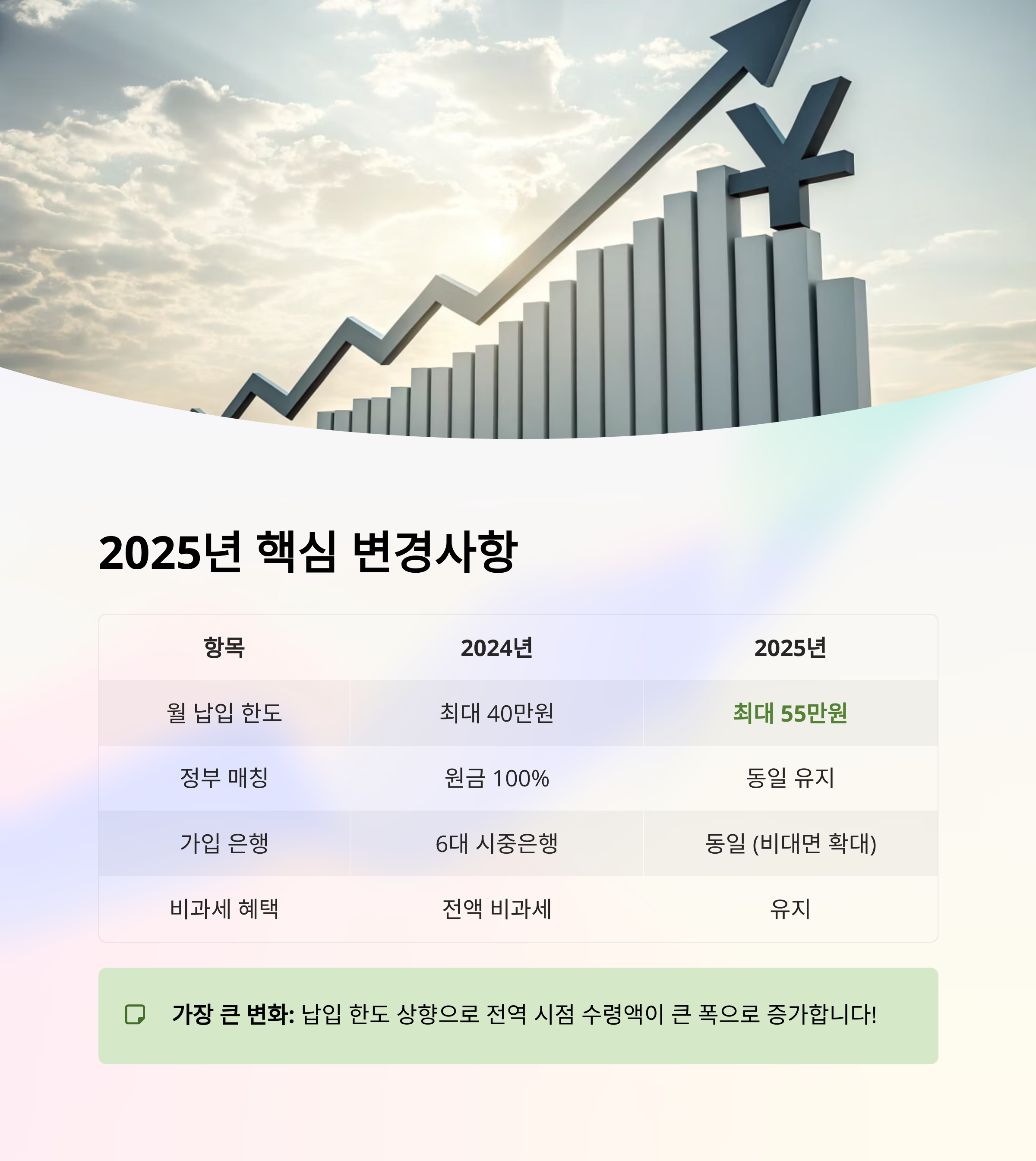 | 월 납입 한도 | 최대 40만원 | 최대 55만원 |