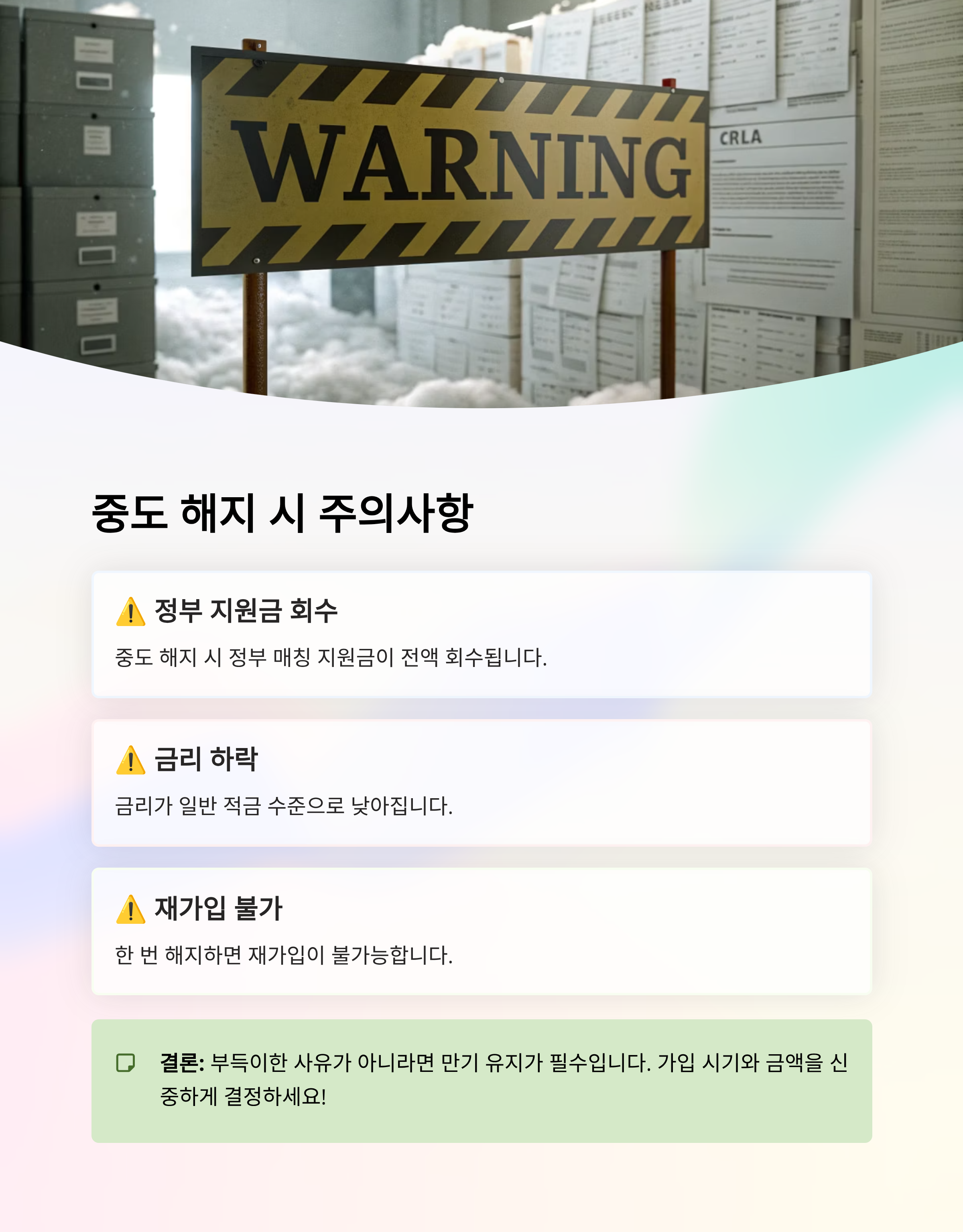 중도 해지할 경우 정부 매칭 지원금이 전액 회수되며, 금리 또한 일반 적금 수준으로 낮아집니다. 따라서 부득이한 사유가 아니라면 만기 유지가 필수입니다. 재가입은 불가능하므로, 가입 시기와 금액을 신중하게 결정해야 합니다.