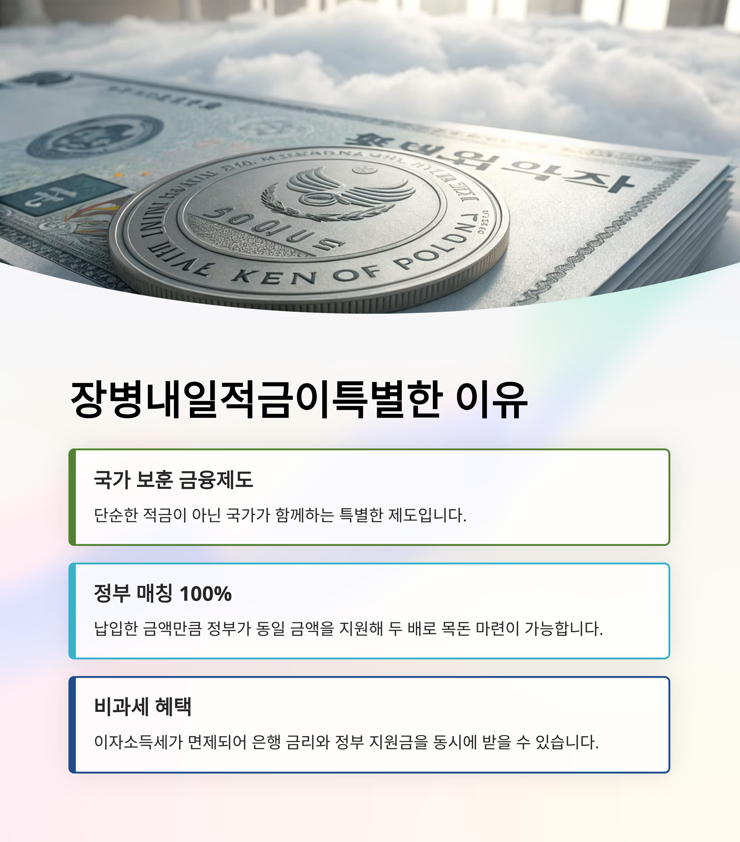 장병내일적금은 단순한 적금이 아닌 ‘국가 보훈 금융제도’라 할 수 있습니다. 군 복무 기간 동안 납입한 금액에 정부가 동일한 금액을 매칭해주기 때문에, 저축한 만큼 두 배로 목돈을 마련할 수 있습니다. 또한 이자소득세가 면제되는 비과세 상품으로, 은행 금리와 정부 지원금을 동시에 받을 수 있는 유일한 제도입니다.