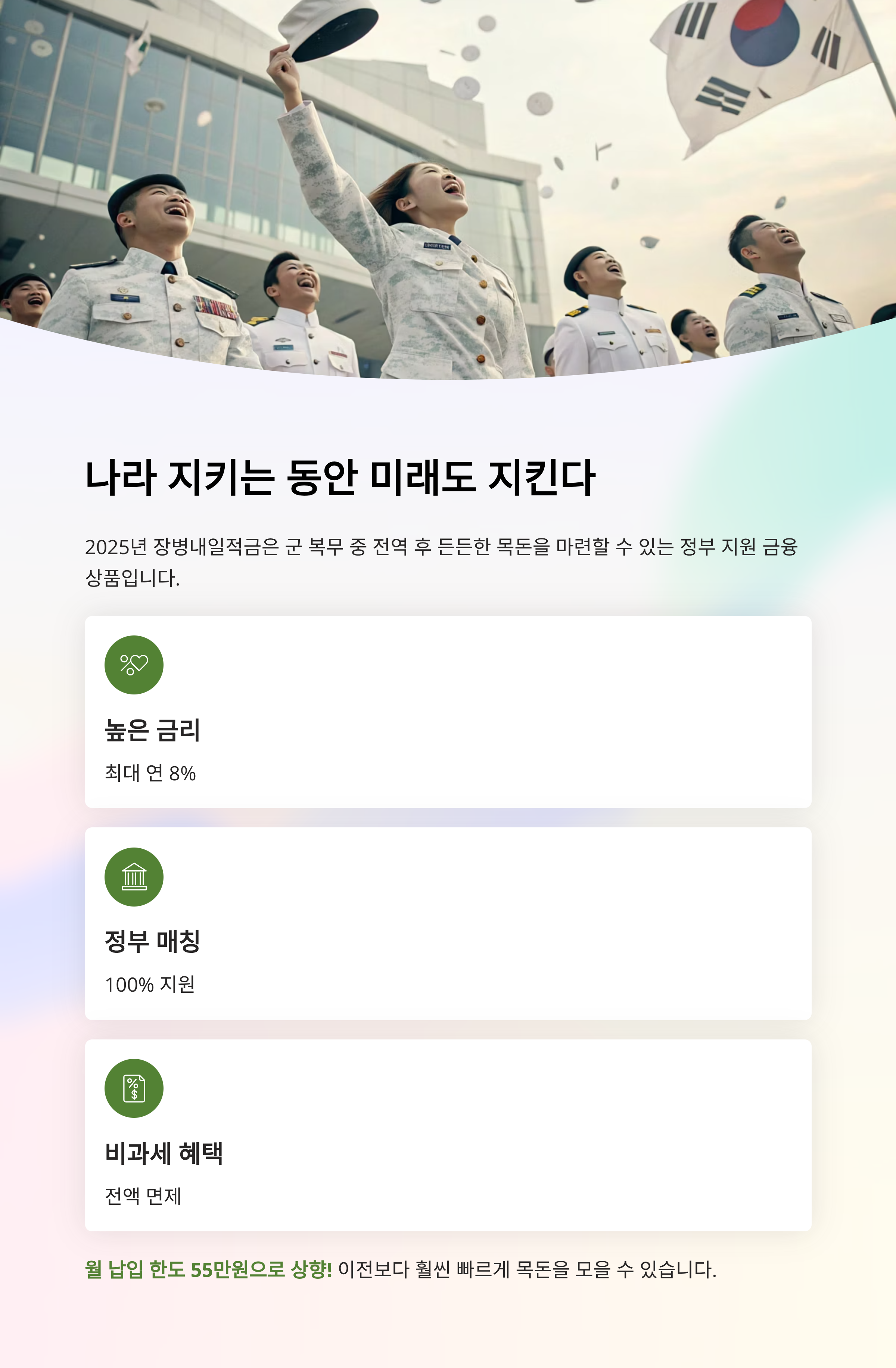 2025년 장병내일적금은 군 복무 중인 장병들이 전역 후 든든한 목돈을 마련할 수 있도록 설계된 정부 지원 금융상품입니다. 높은 금리와 정부 매칭 지원금, 비과세 혜택까지 더해져 ‘군 복무 = 목돈 마련의 기회’라는 공식이 완성되었죠. 올해는 월 납입 한도가 55만원으로 상향되어, 이전보다 훨씬 빠르게 목돈을 모을 수 있다는 점에서 더욱 주목받고 있습니다. 이번 글에서는 금리, 조건, 한도, 수령액까지 모든 정보를 정리해드립니다.
