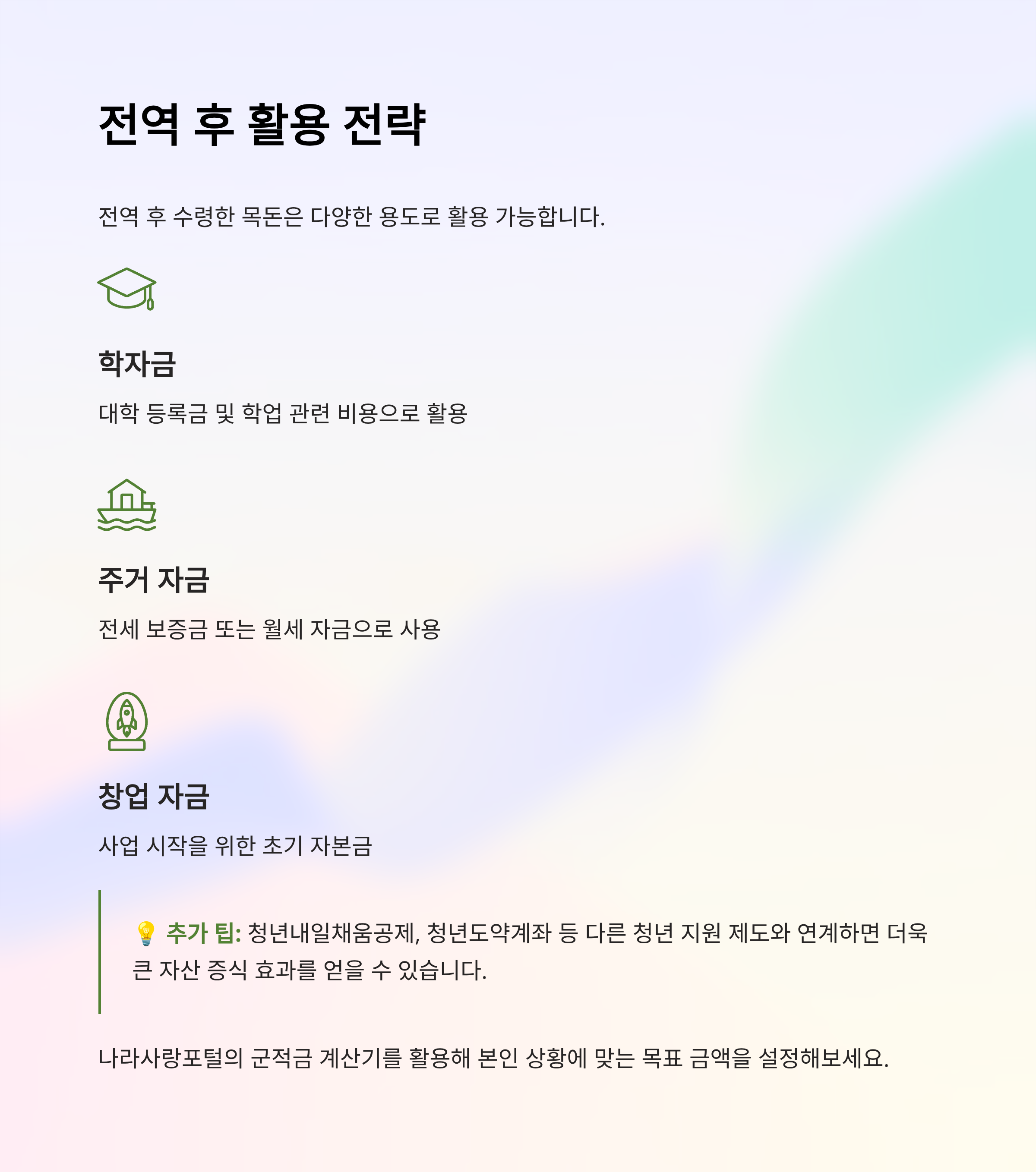 전역 후 수령한 목돈은 학자금, 주거 자금, 창업 자금 등 다양한 용도로 활용 가능합니다. 특히 청년내일채움공제, 청년도약계좌 등 다른 청년 지원 제도와 연계하면 더욱 큰 자산 증식 효과를 얻을 수 있습니다. 나라사랑포털의 군적금 계산기를 활용해 본인 상황에 맞는 목표 금액을 설정해두면 좋습니다.