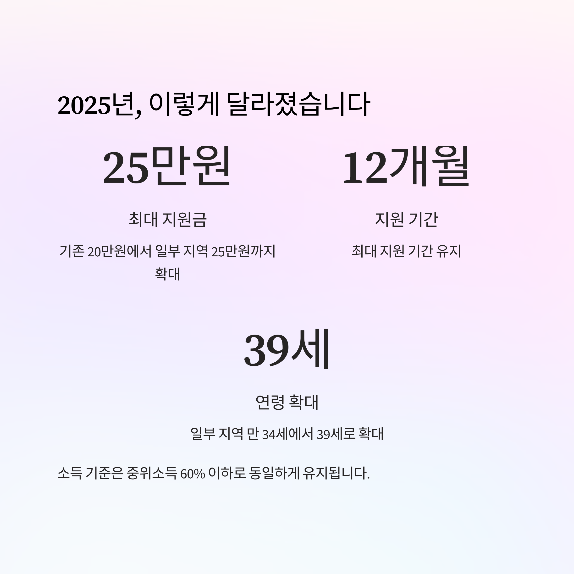 | 최대 지원금액 | 월 20만 원 | 월 20~25만 원 (지자체별 차등) |