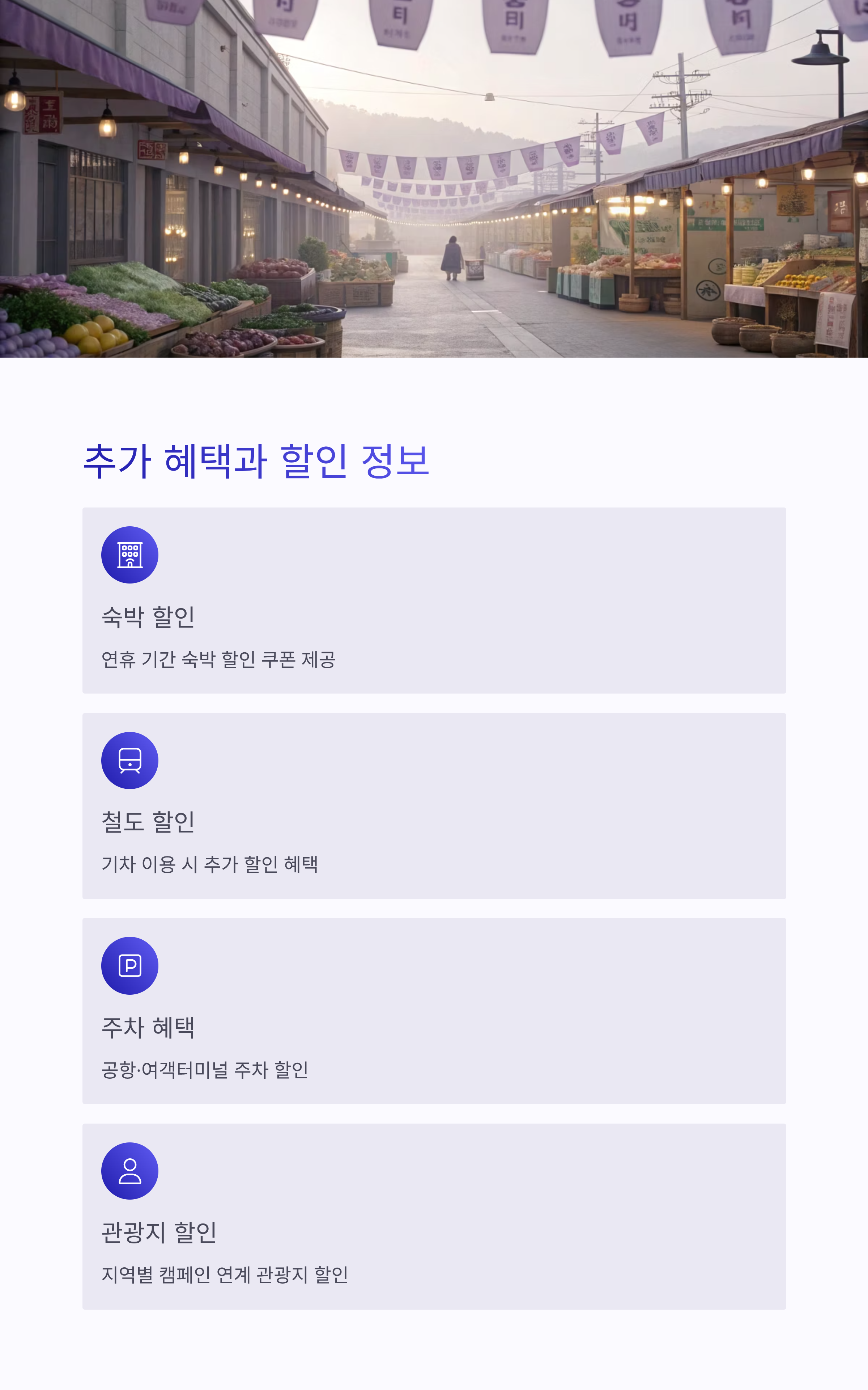 추석 연휴 기간에는 숙박 할인 쿠폰, 철도 할인, 공항·여객터미널 주차 혜택 등 교통·숙박 관련 추가 혜택이 제공될 예정입니다. 지역별 캠페인과 연계한 관광지 할인도 있으니 여행 계획과 예산 절감에 도움이 될 수 있습니다.