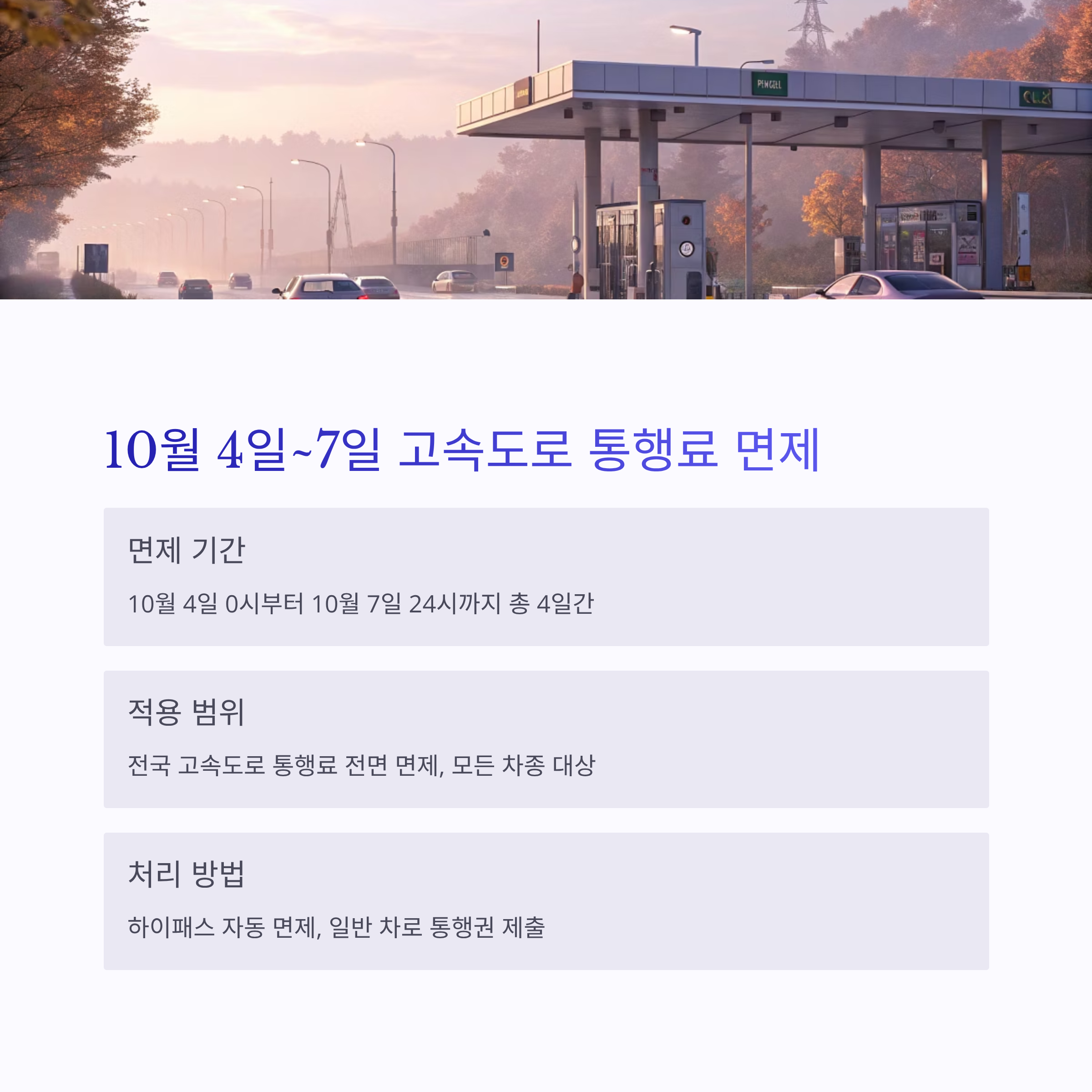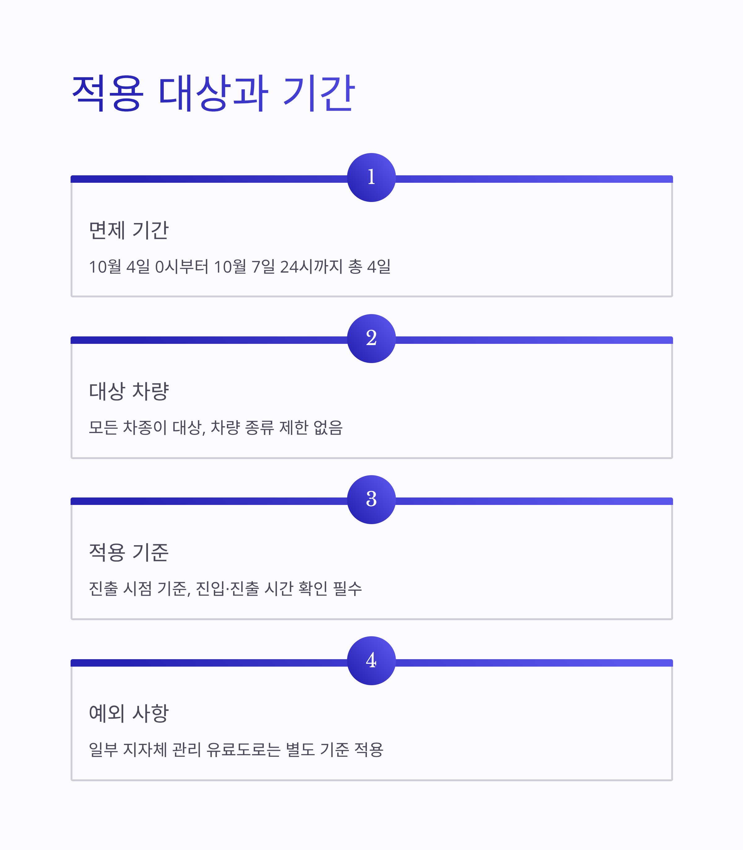 적용 기간은 10월 4일 0시부터 10월 7일 24시까지 총 4일입니다. 모든 차종이 대상이며, 진출 시점이 면제 기준이므로 고속도로 진입·진출 시간을 꼭 확인하세요. 단, 일부 지자체 관리 유료도로는 별도 기준이 적용될 수 있어 출발 전 확인을 권합니다.