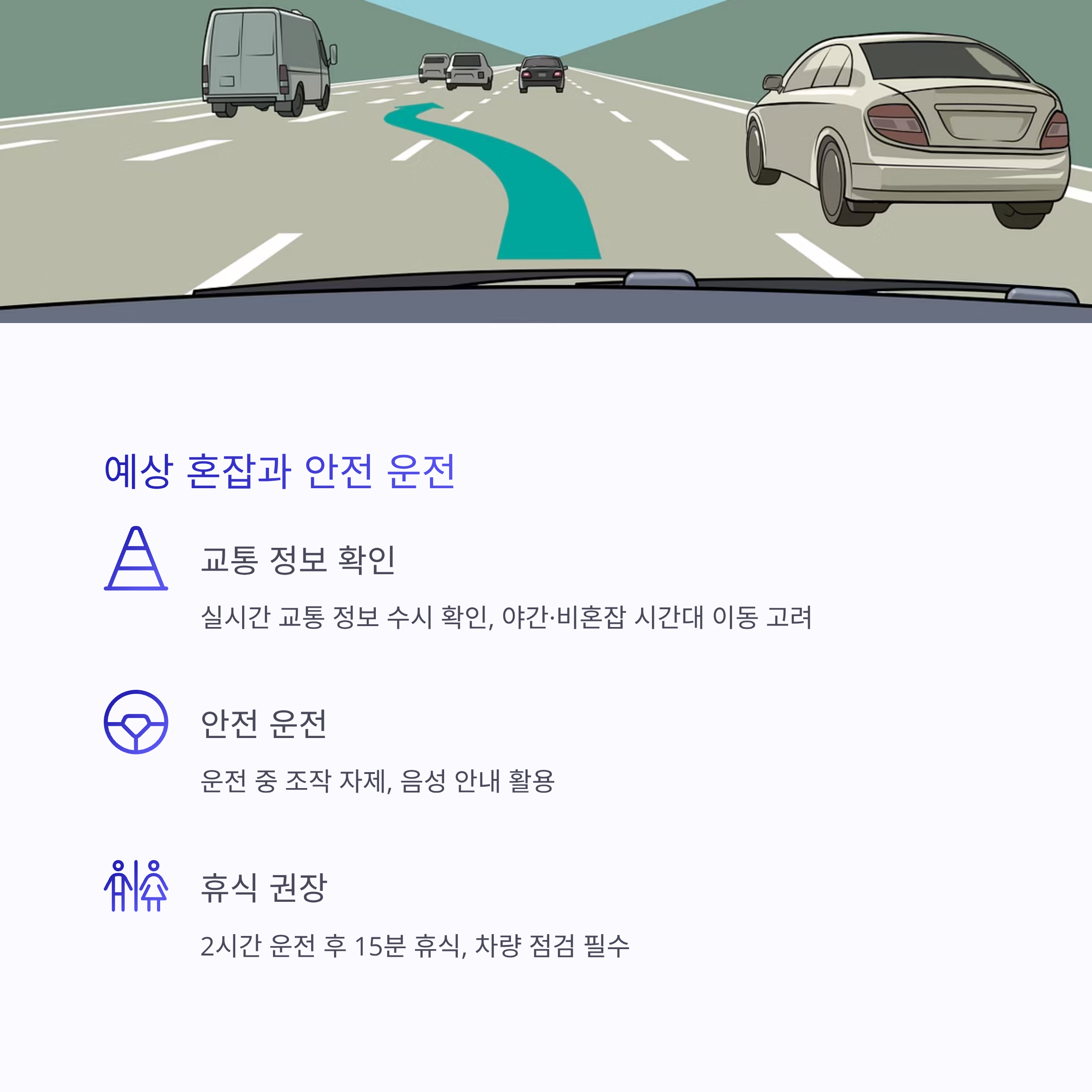 추석 연휴는 평상시보다 차량 통행량이 크게 늘어납니다. 실시간 교통 정보를 수시로 확인하고, 가능한 야간·비혼잡 시간대 이동을 고려하세요. 운전 중 조작은 자제하고 음성 안내를 활용하시며, 2시간 운전 후 15분 휴식 권장합니다. 차량 점검도 필수입니다.