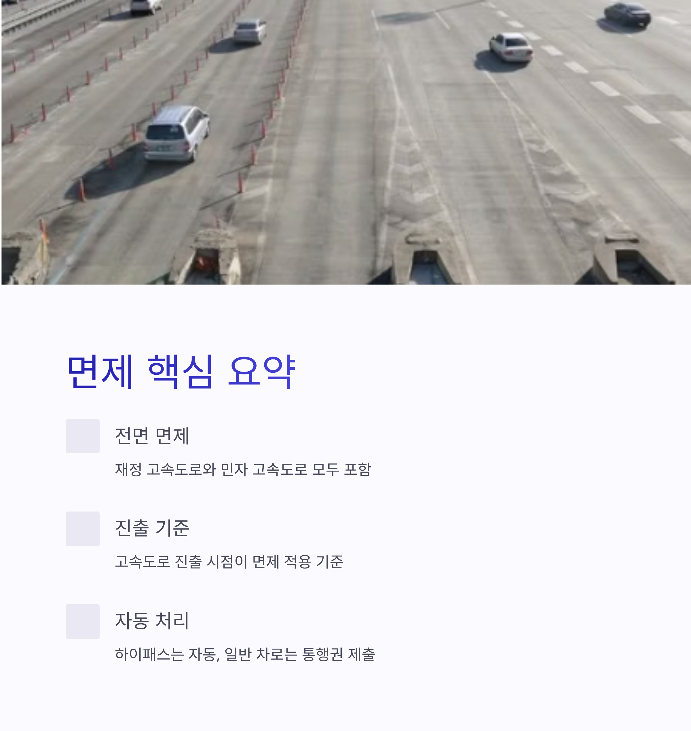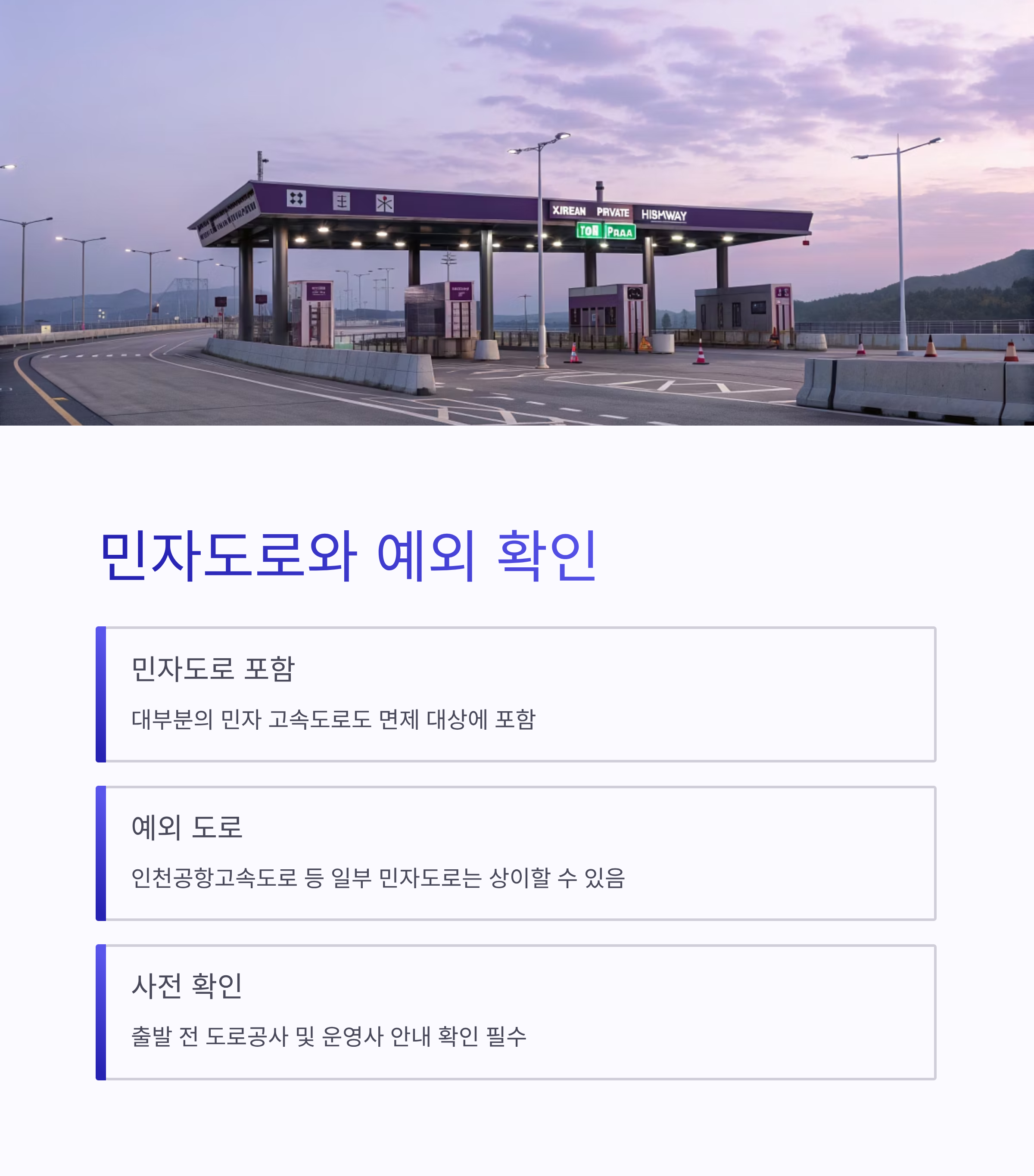 대체로 민자 고속도로도 면제 대상이나, 인천공항고속도로 등 일부 민자도로와 지자체 관리 유료도로는 면제 여부가 상이할 수 있습니다. 출발 전 한국도로공사 알림과 해당 민자도로 운영사 안내를 확인하시기 바랍니다.