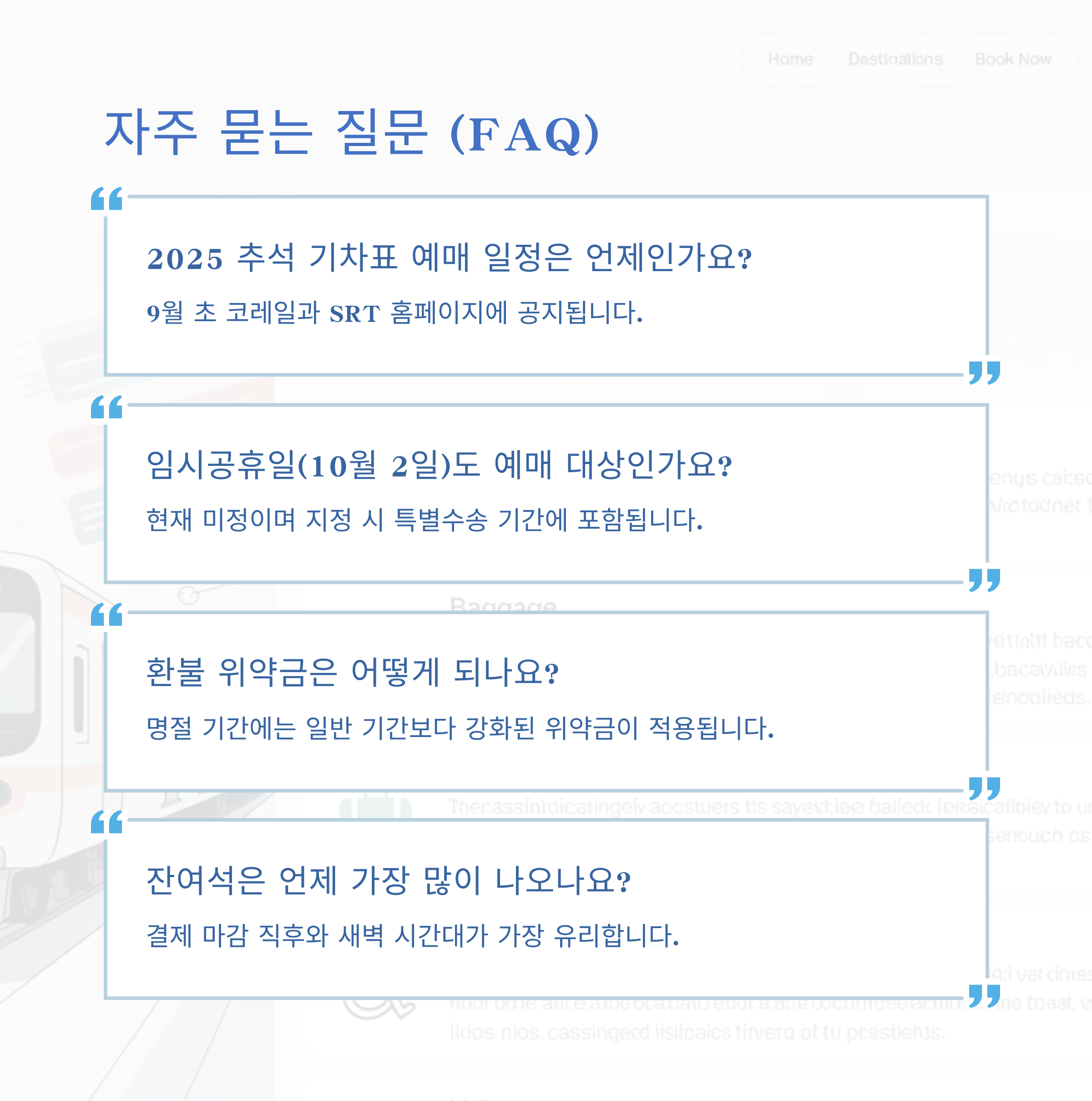 2025 추석 기차표 예매는 올해도 치열할 전망입니다. 임시공휴일 여부와 최종 일정은 9월 초 공지를 반드시 확인해야 하며, 실패 후에도 취소표 기회가 충분하다는 점을 잊지 마시기 바랍니다. 철저히 준비해 원하는 시간대 좌석을 확보하시고, 올 추석에는 가족과 여유롭고 따뜻한 시간을 보내시길 바랍니다.