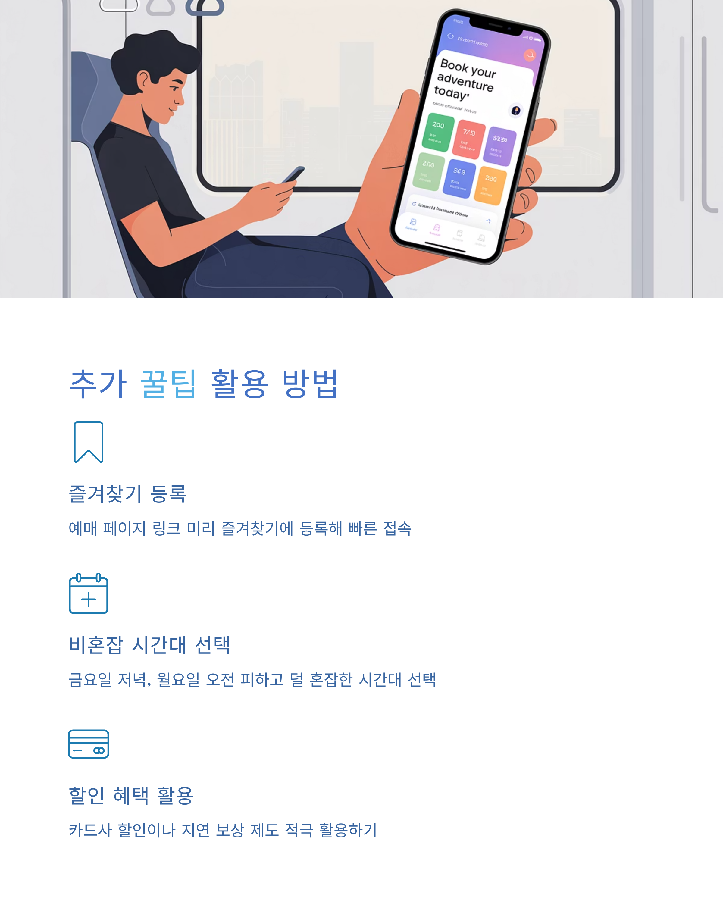 즐겨찾기 링크를 미리 등록해 두면 원하는 페이지로 바로 접속할 수 있습니다. 또한 금요일 저녁이나 월요일 오전과 같은 혼잡한 시간대를 피하는 것도 전략입니다. 카드사 할인이나 지연 보상 제도를 활용하면 비용 절감에도 도움이 됩니다.