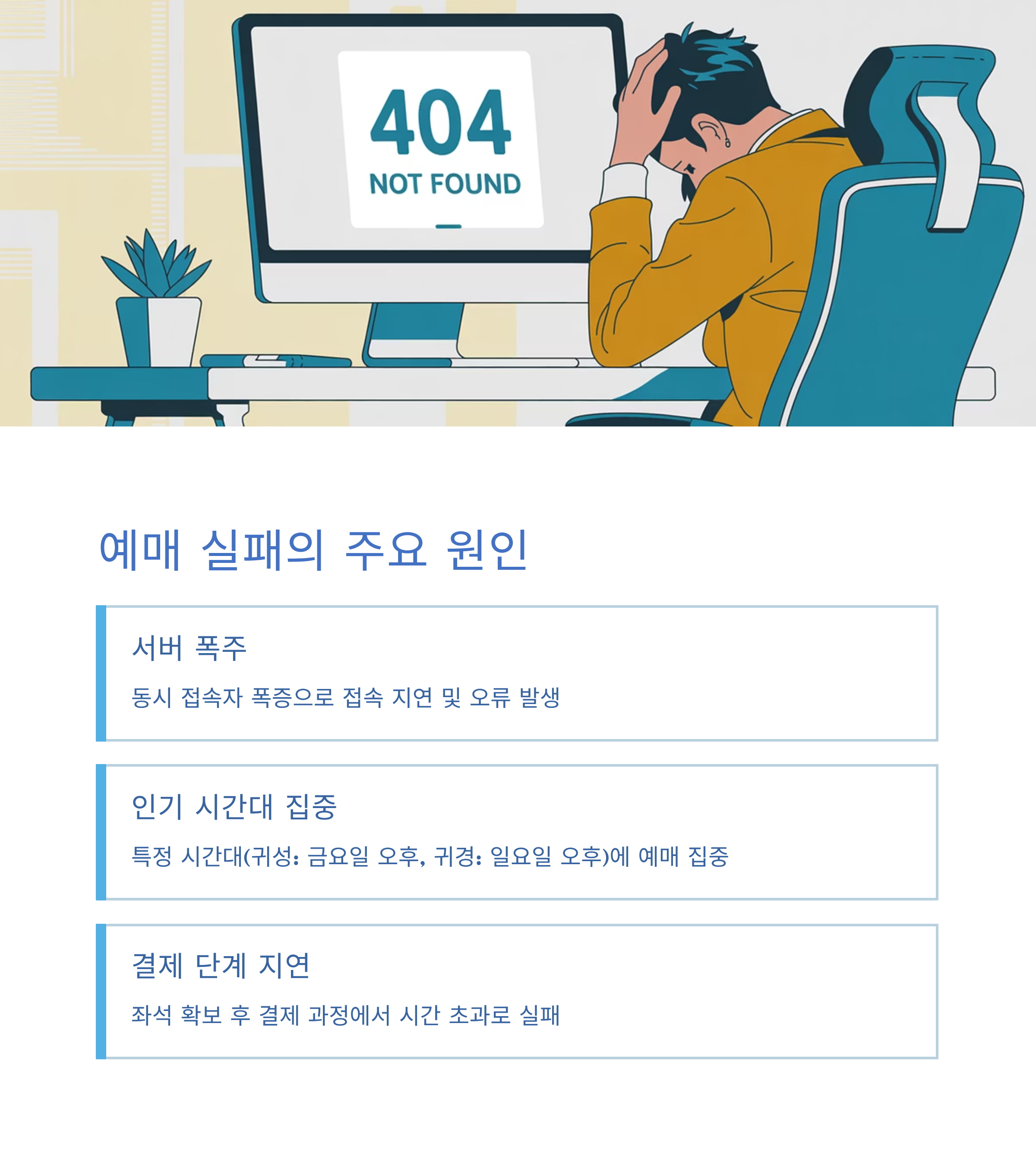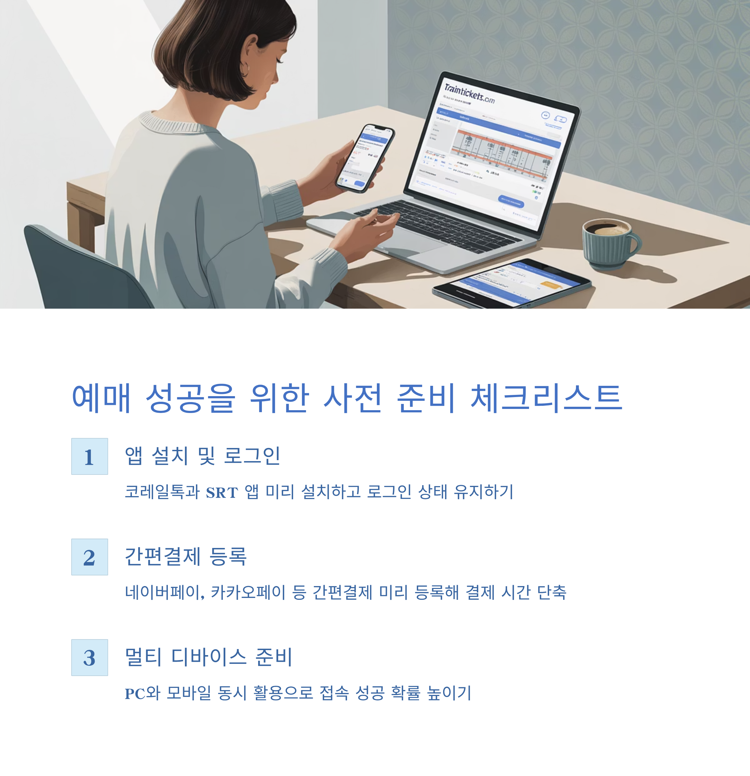 예매는 초 단위의 경쟁입니다. 시작 3분 전부터 접속을 유지하고 새로고침은 피해야 합니다. 로그인 상태를 유지한 뒤 출발역과 도착역을 빠르게 입력하고, 끝칸 좌석이나 1~2인석을 우선적으로 선택하는 것이 좋습니다. 결제 단계에서는 간편결제를 활용하여 30초 이내로 완료해야 성공 확률이 높습니다.