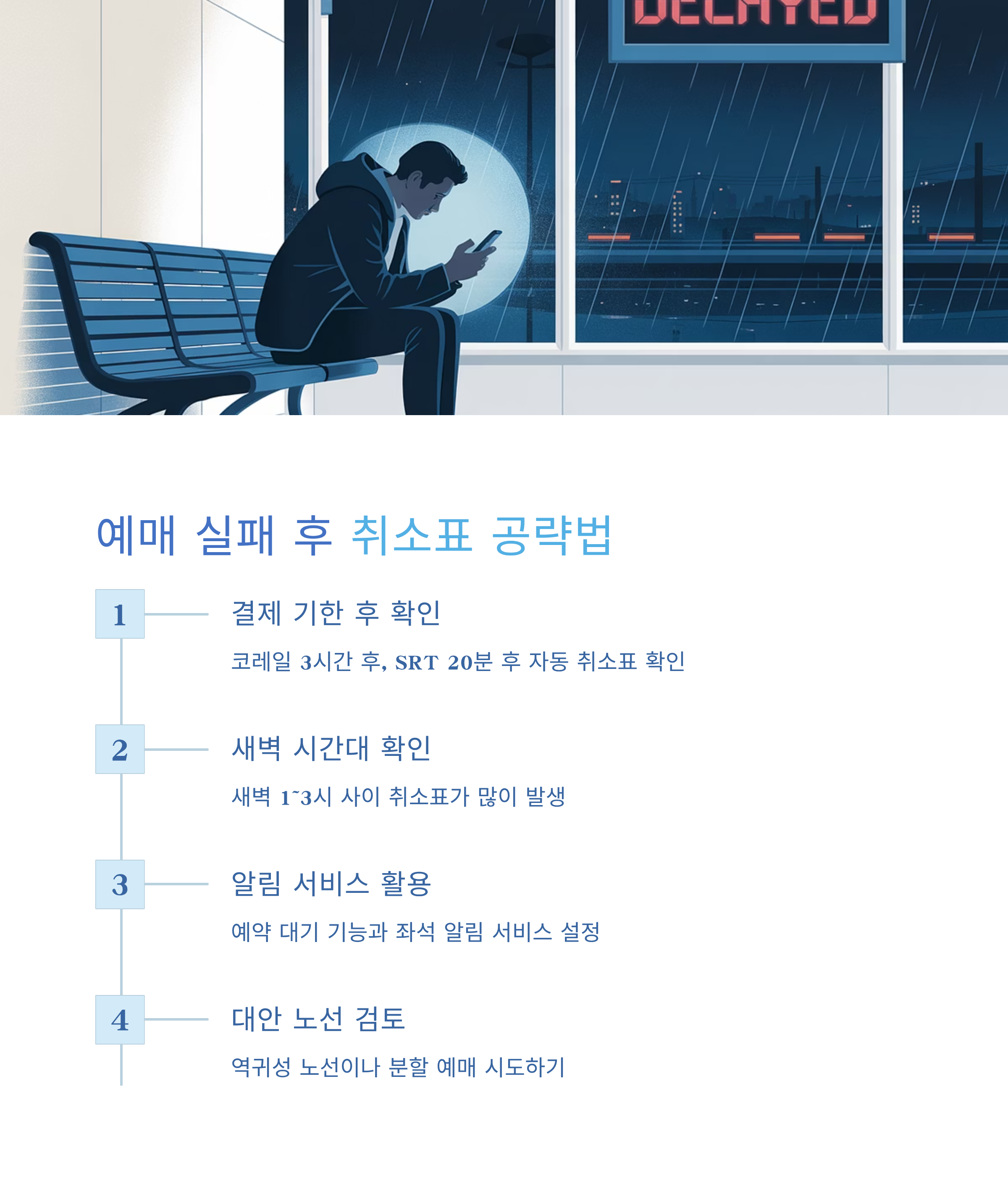 표를 놓쳤다고 해서 끝난 것은 아닙니다. 예약 후 결제 기한이 지나면 자동 취소표가 나오기 때문에 3시간 후와 새벽 시간대에 잔여석을 다시 확인하는 것이 효과적입니다. 또한 예약 대기 기능과 좌석 알림 서비스를 활용하면 기회를 더 잡을 수 있습니다. 역귀성 노선이나 분할 예매도 좋은 대안이 됩니다.