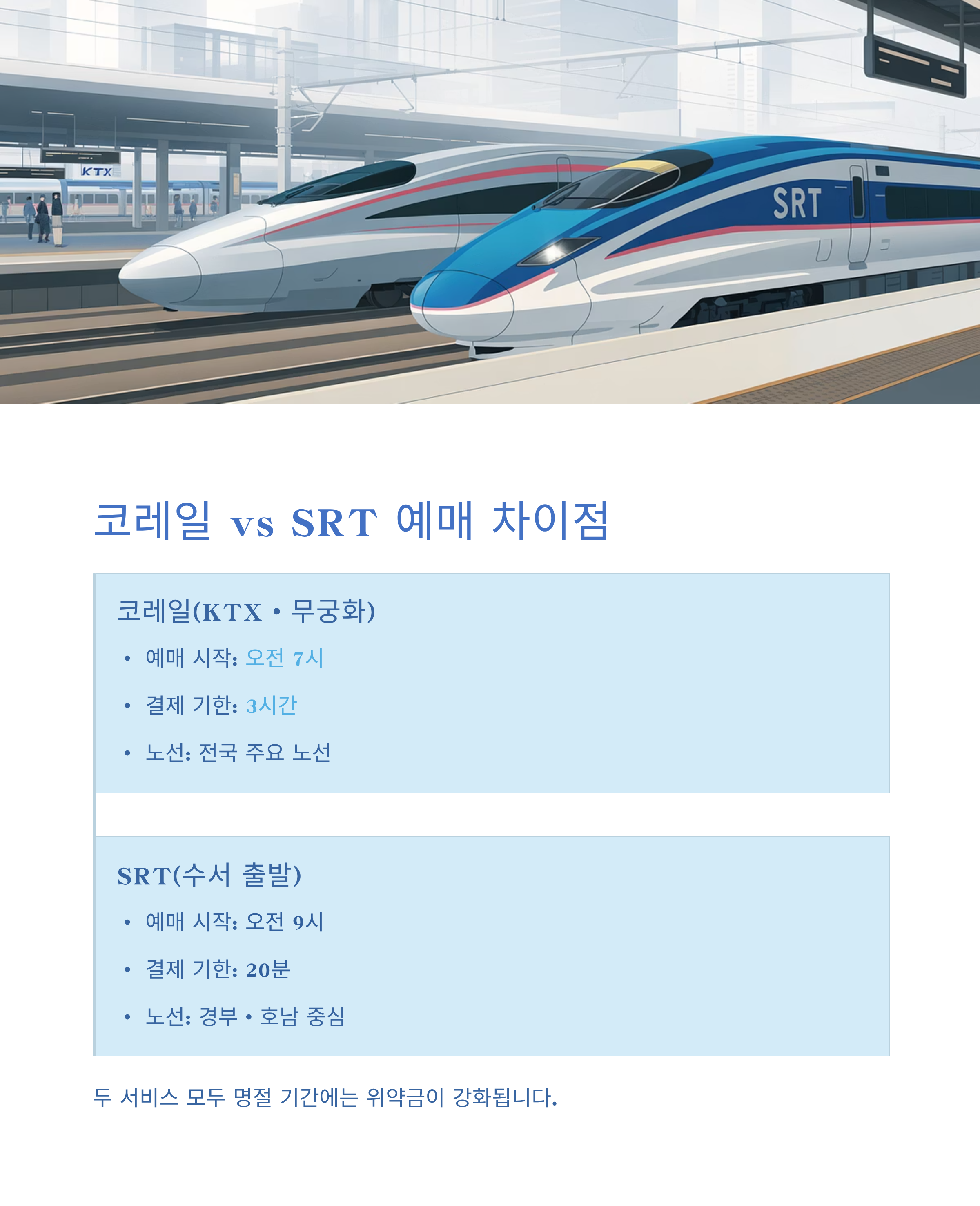코레일과 SRT는 예매 시작 시간과 결제 기한에서 차이가 있습니다. 코레일은 오전 7시에 예매를 시작하며 결제 기한이 3시간입니다. 반면 SRT는 오전 9시 시작으로 결제 기한이 단 20분밖에 되지 않으므로 빠른 결제가 필수입니다.